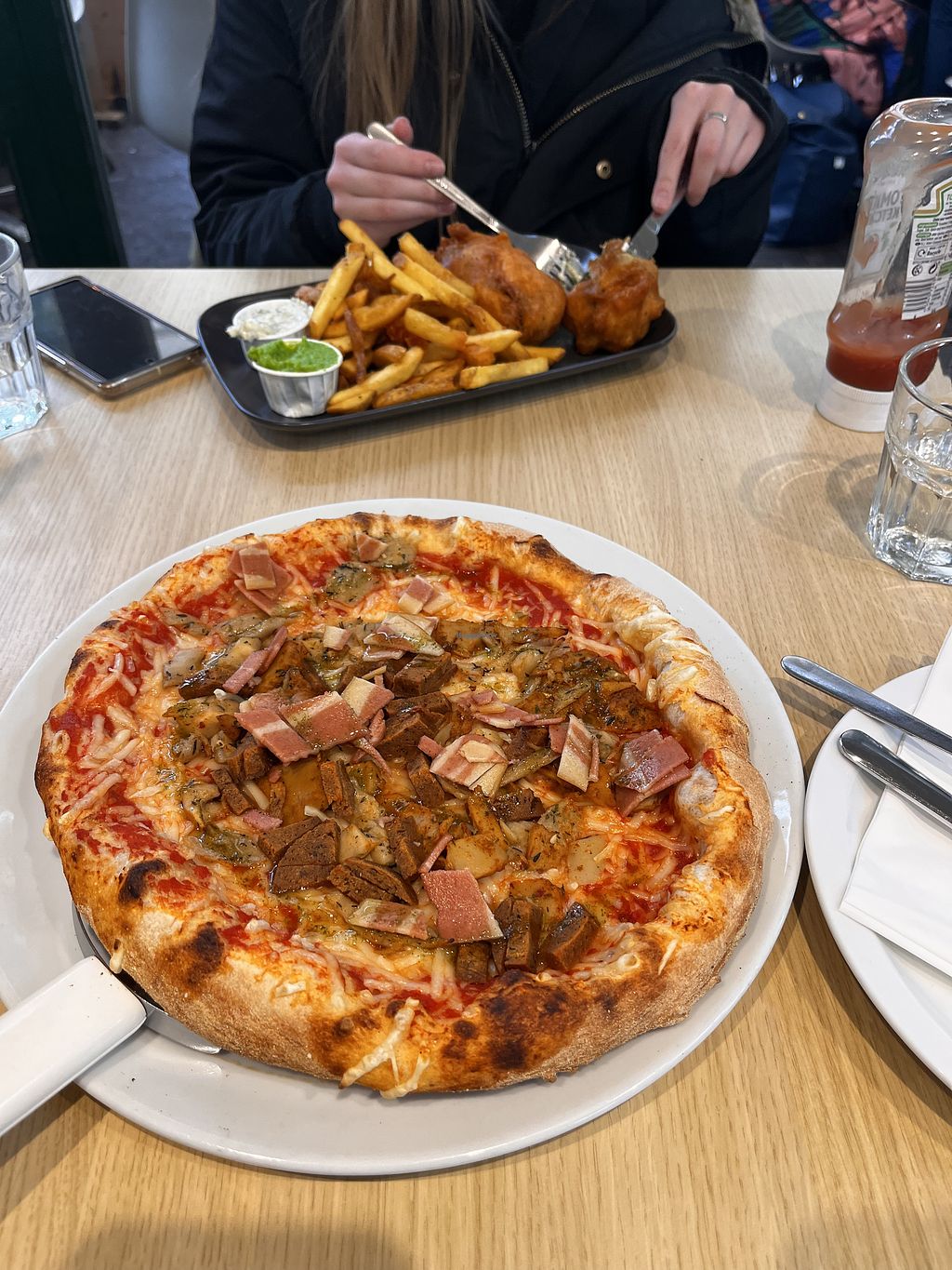We had two pizzas, one chick’n wrap and tofish along with a cider and beer. Everything was delicious. So much better than the tofish we had at another vegan London restaurant. This one tasted like fish. I wish that we had more time to come back.