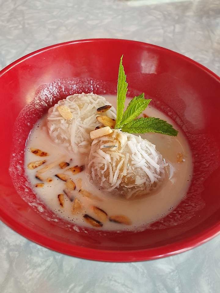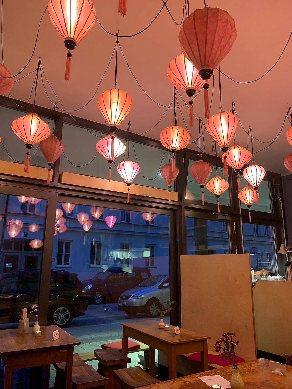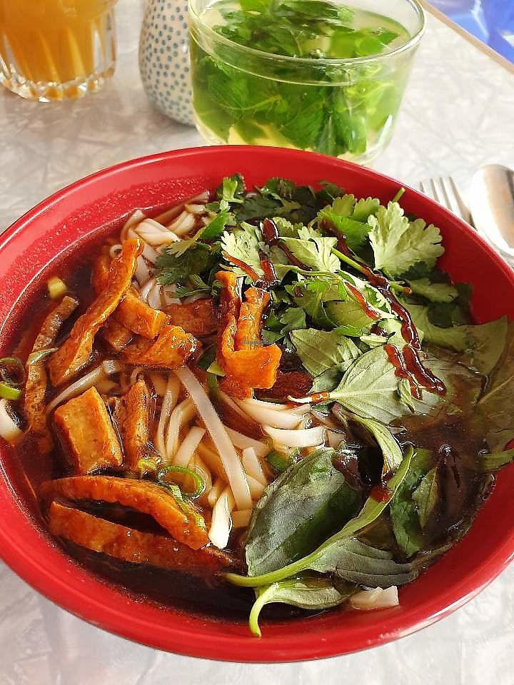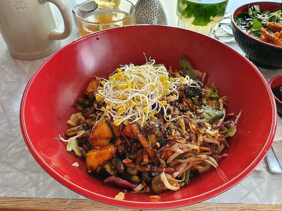 Reisnudelsalat mit Tofu, im Hintergrund Gemüseschale mit Reis
