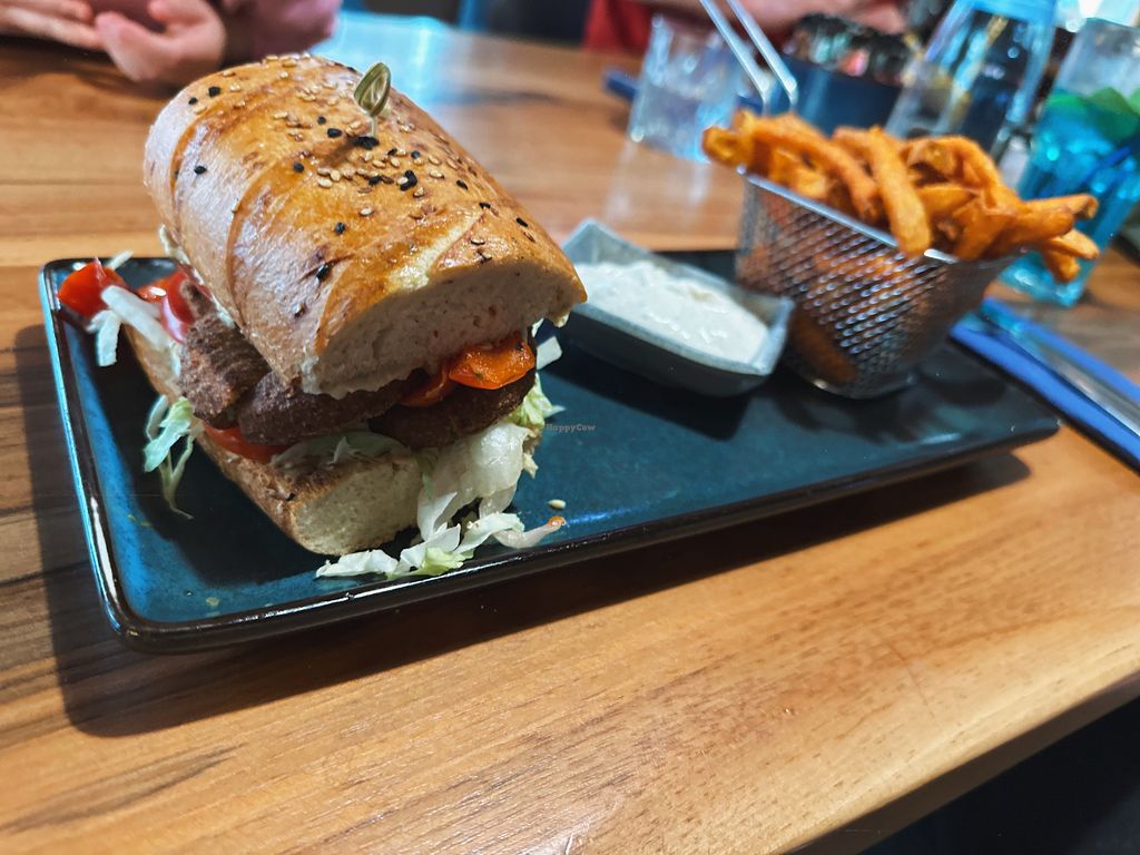 Habe den Veganen falafel Burger mit süßkartoffelpommes gegessen. War sehr sehr lecker.