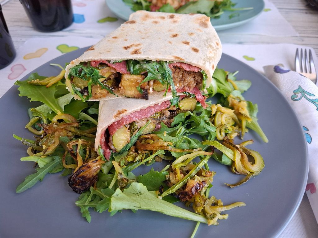 Piadina con zucchine saltate in padella, rucola, salame veg e formaggi…