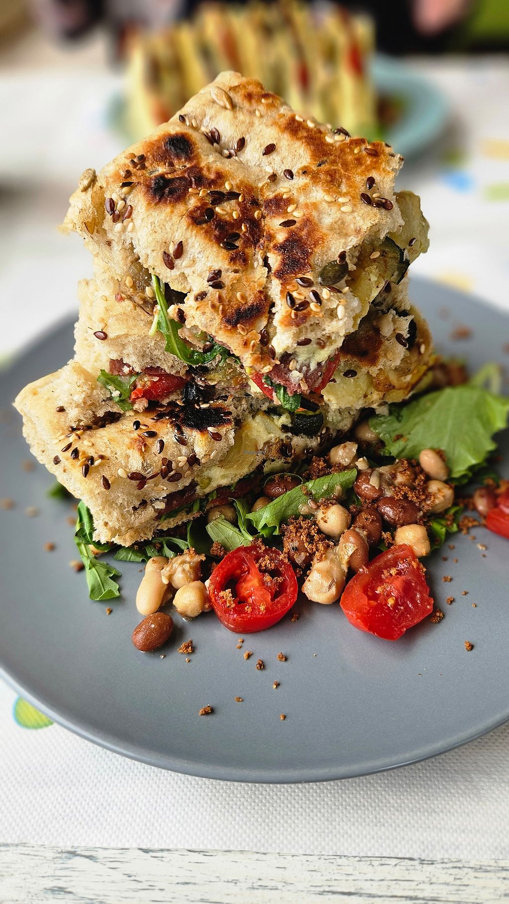 Vegan toast with grilled veggies, beans, salad & cold cuts 😋