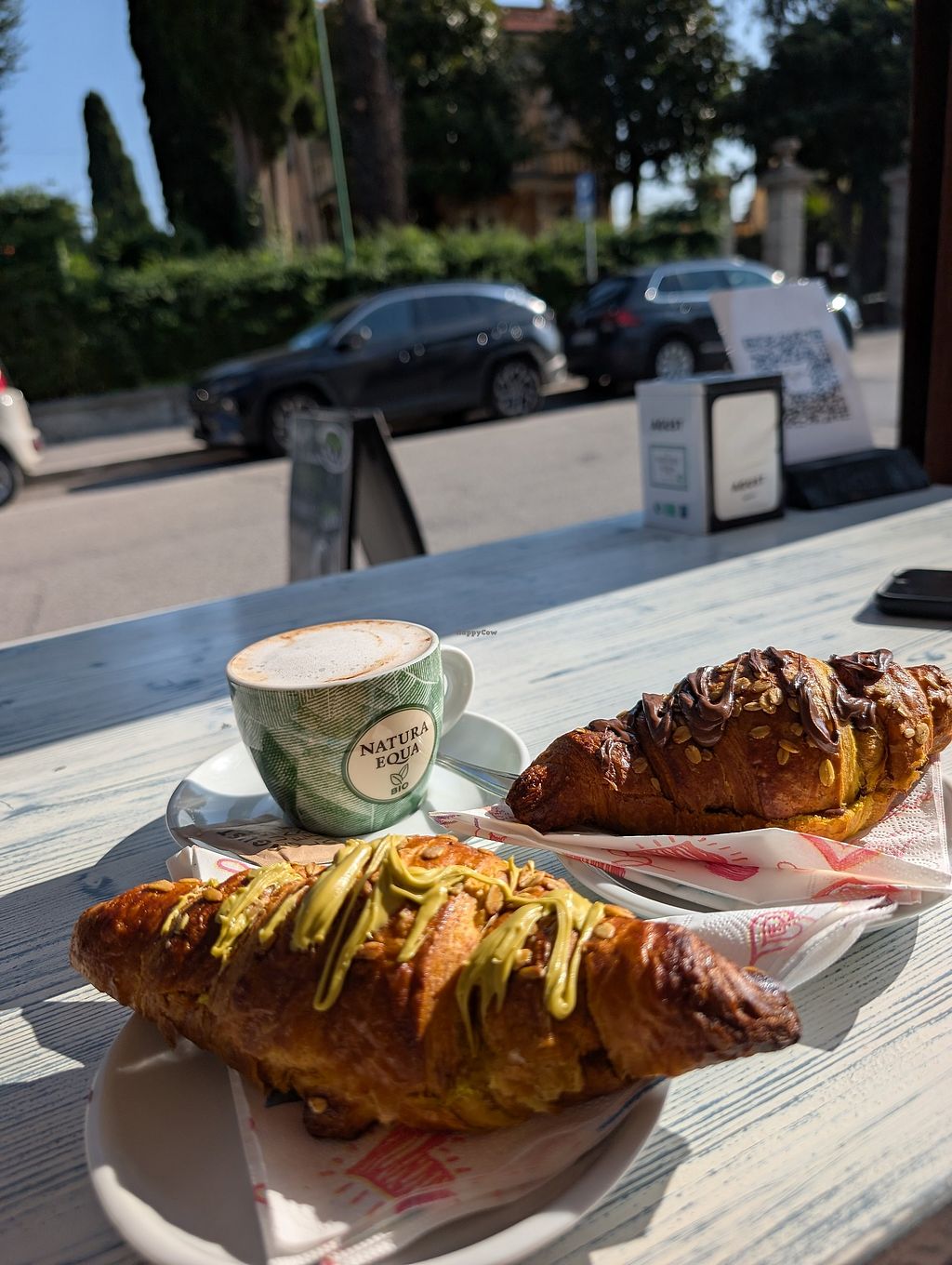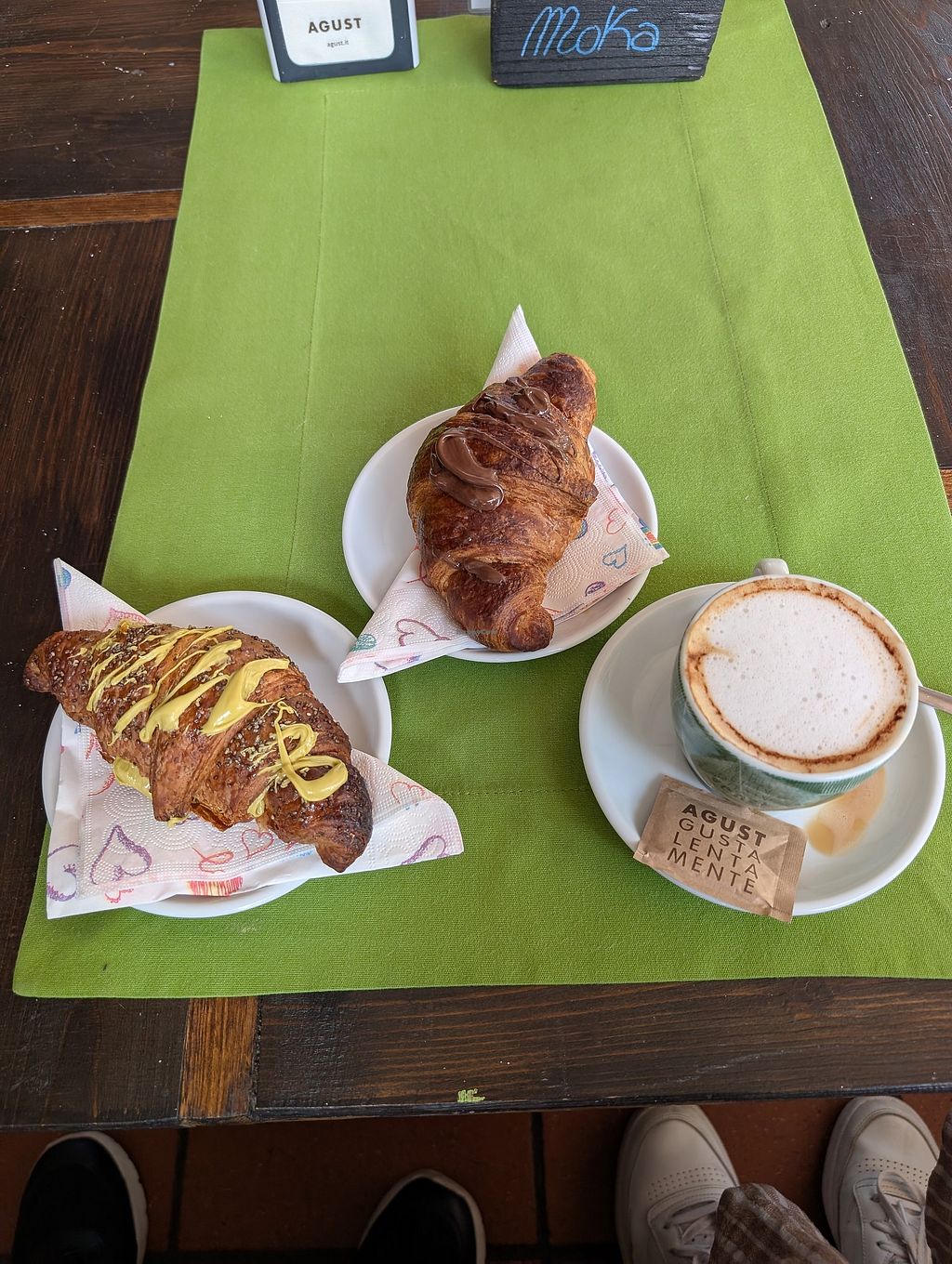 Pistachio and hazelnut chocolate cream croissants and a cappuccino