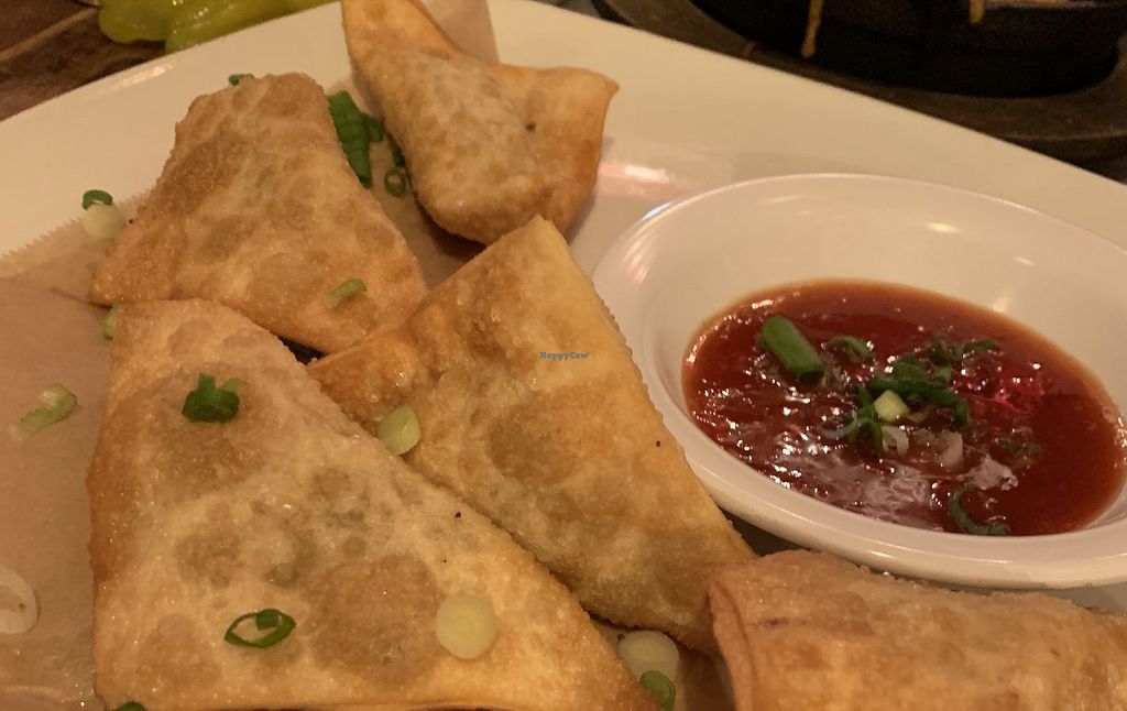 Lions mane rangoon topped with scallions and comes with a sweet and sp…