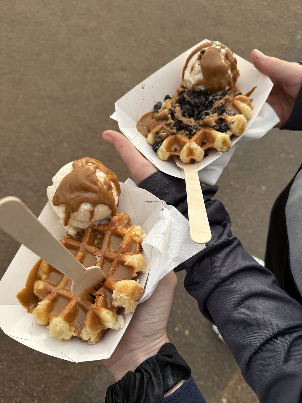 Vegan waffles, vanilla and salted caramel ice cream