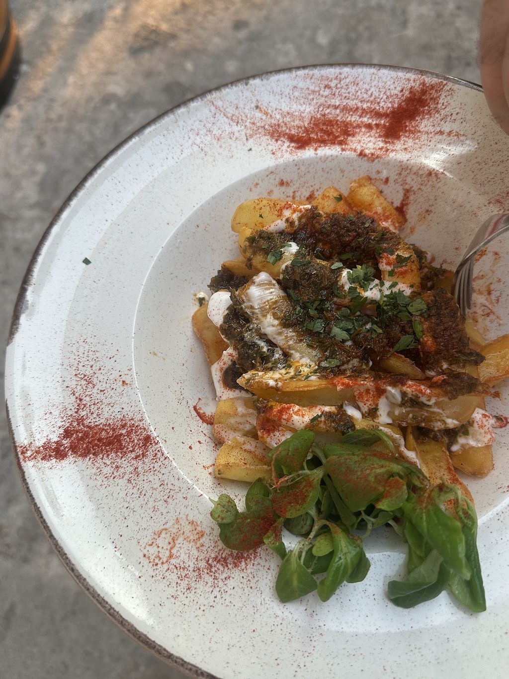 I had the Babaganoush flatbread made vegan (without the cheese), it was pretty tasty! The chimichurri potatoes were oily but delicious! Overall a nice experience, absolutely loved the seating outside!