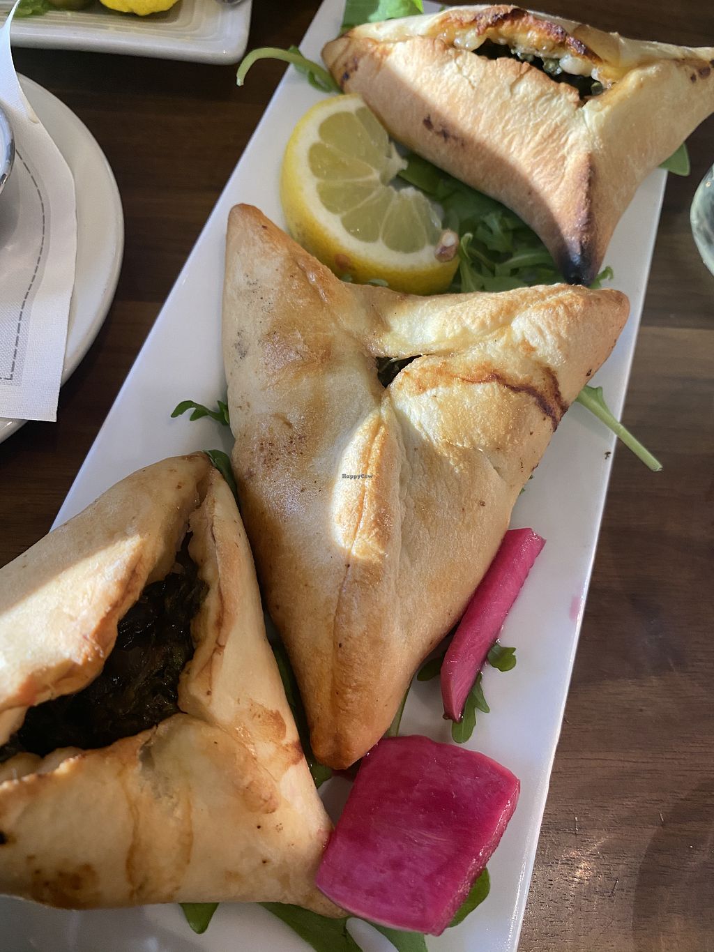Mezze (hummus, baba ganoush, tabouleh, falafel, fries), spinach pies and stuffed grape leaves! Yum! Yum! Yum! Don't waste your tummy space on the fries because you can have fries anywhere! Baba Ganoush, Spinach Pies, Tabouleh were my faves but everything is delicious!!!!! Bar tender was awesome and we loved our drinks!