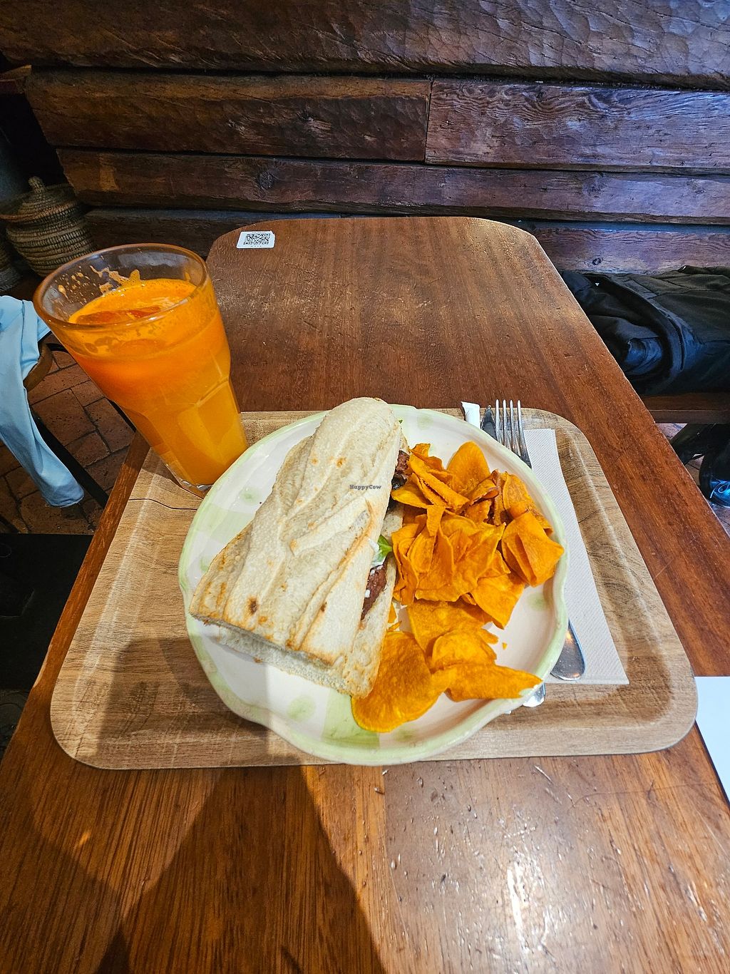 The vegan burger was really good (I assume some kind of beyond meat). The bread would have been vegetarian so they switched it to a vegan one. I liked the sweet potatoes chips, as well.