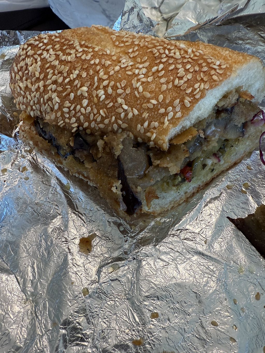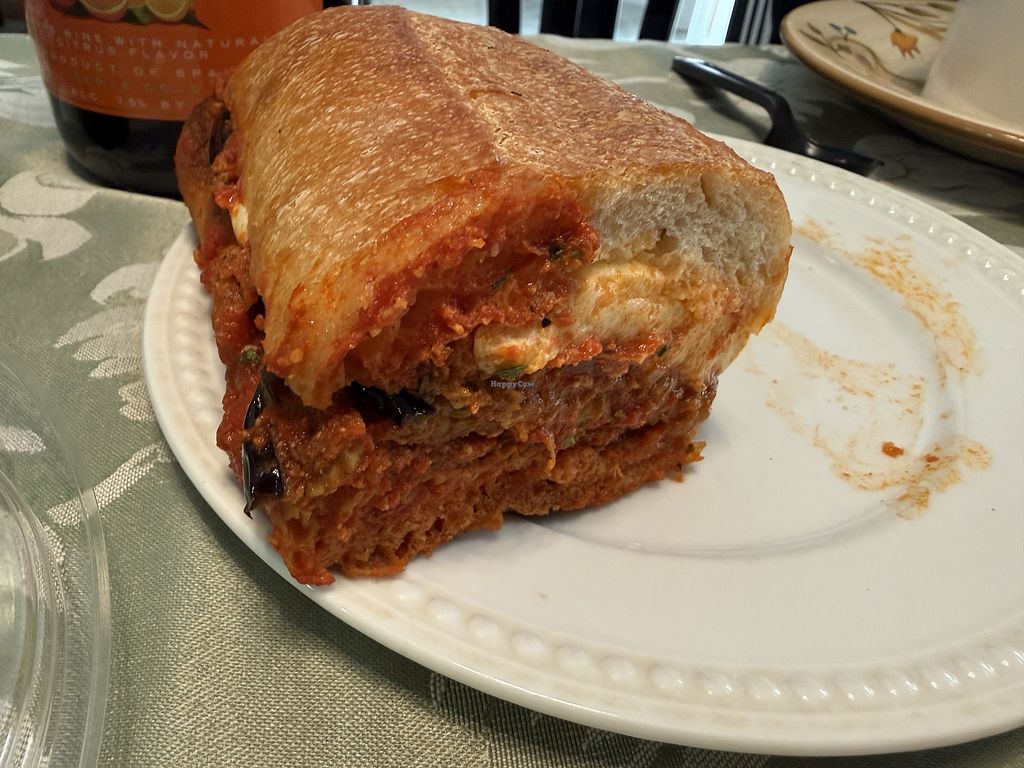 Half of the vegan chicken parm on a semolina roll