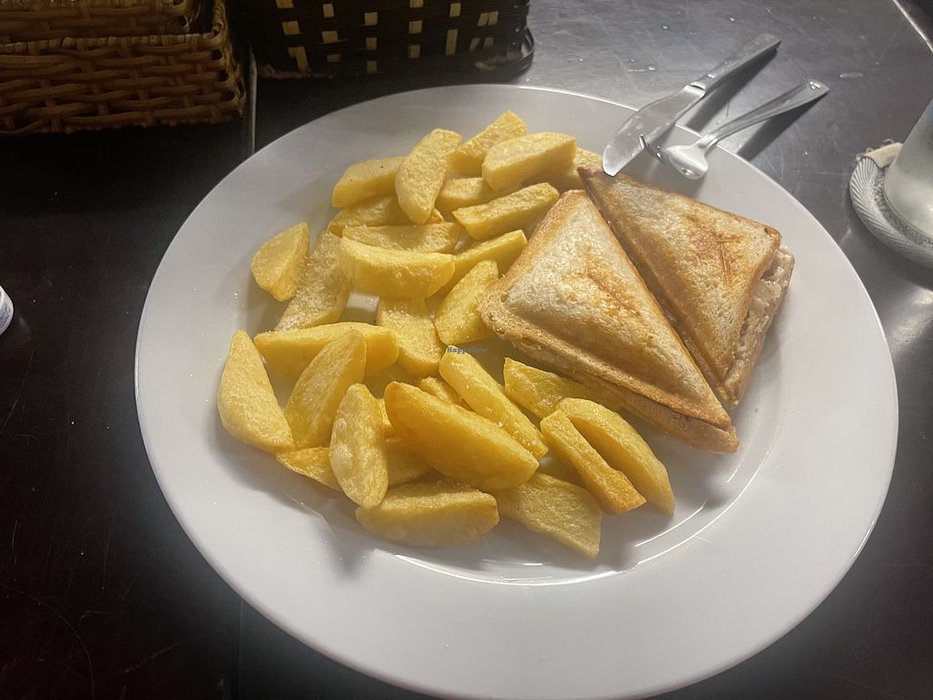Chicken and mushroom pie with baked beans and chips + gravy on the sid…