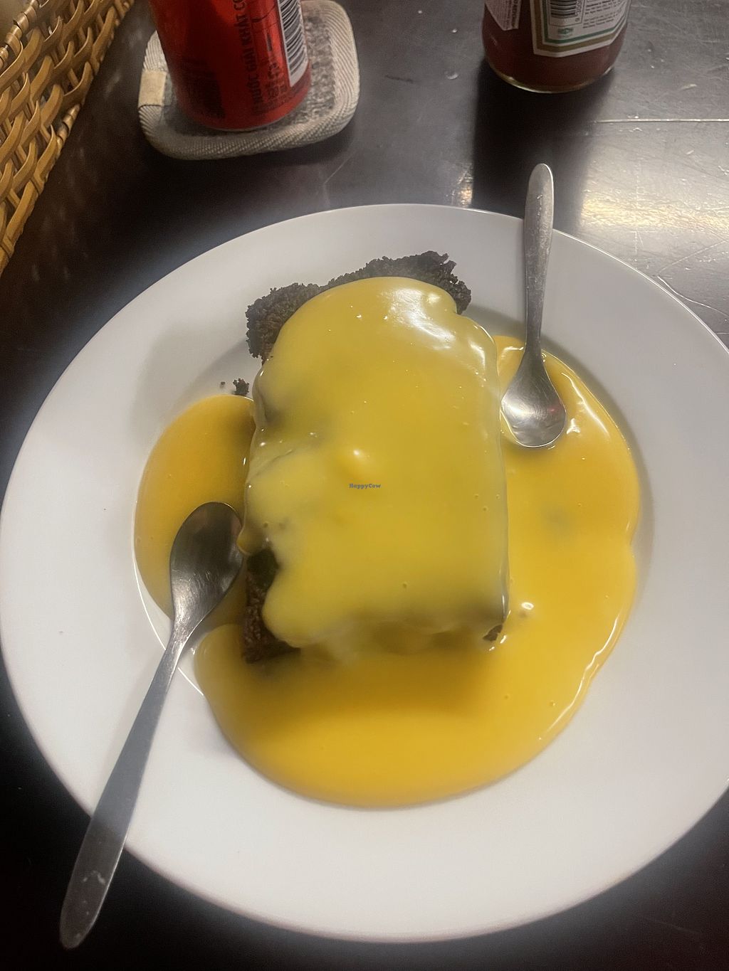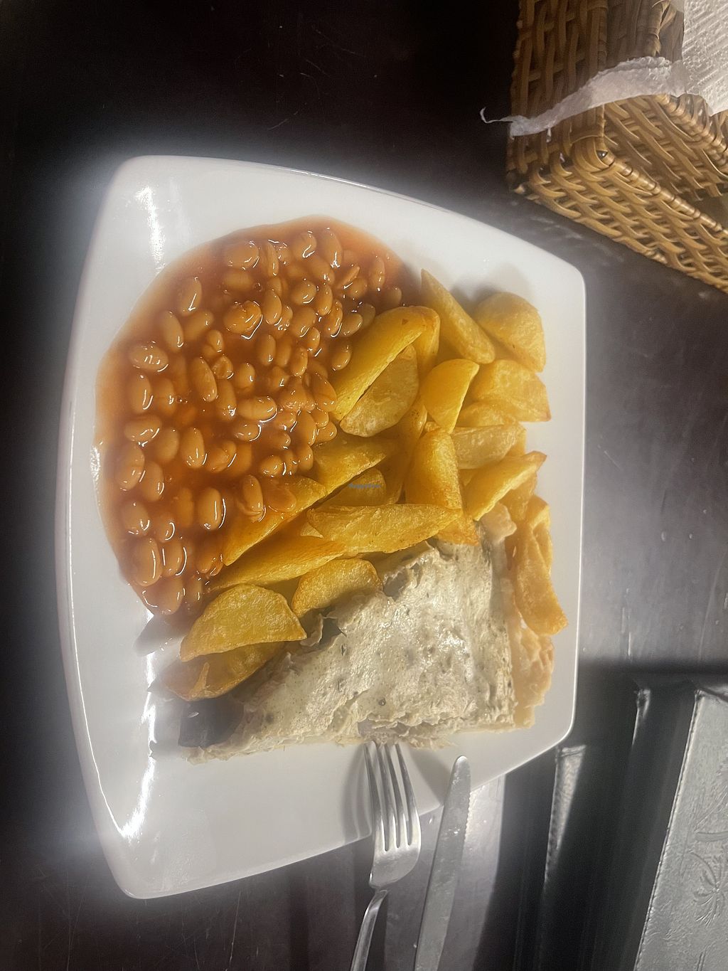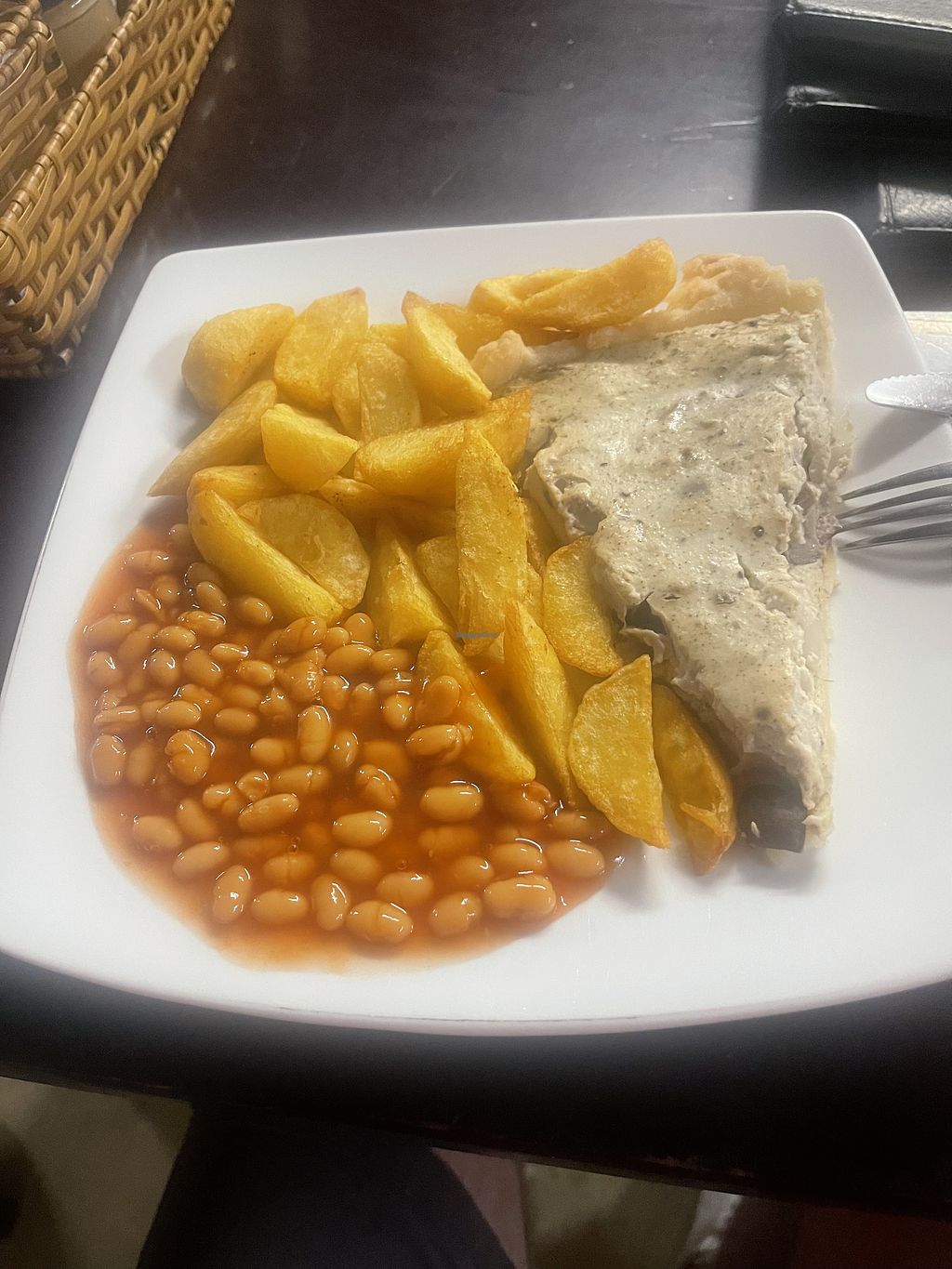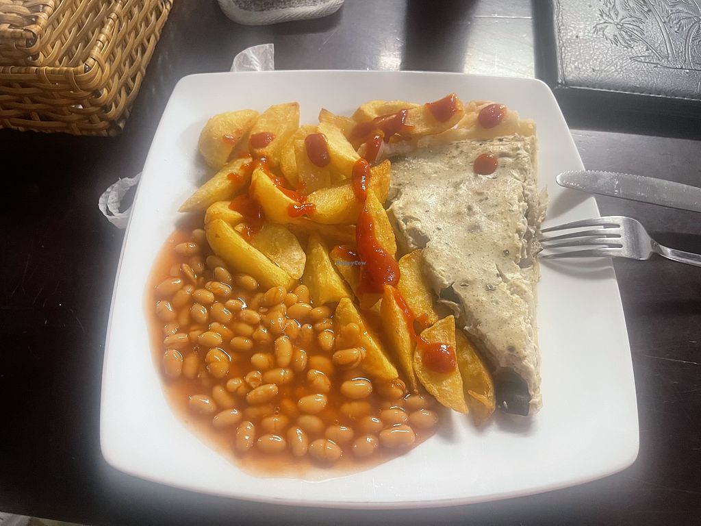Cashew cheese and onion pasty, chips and Heinz baked beanss