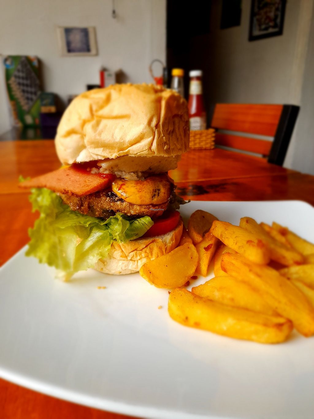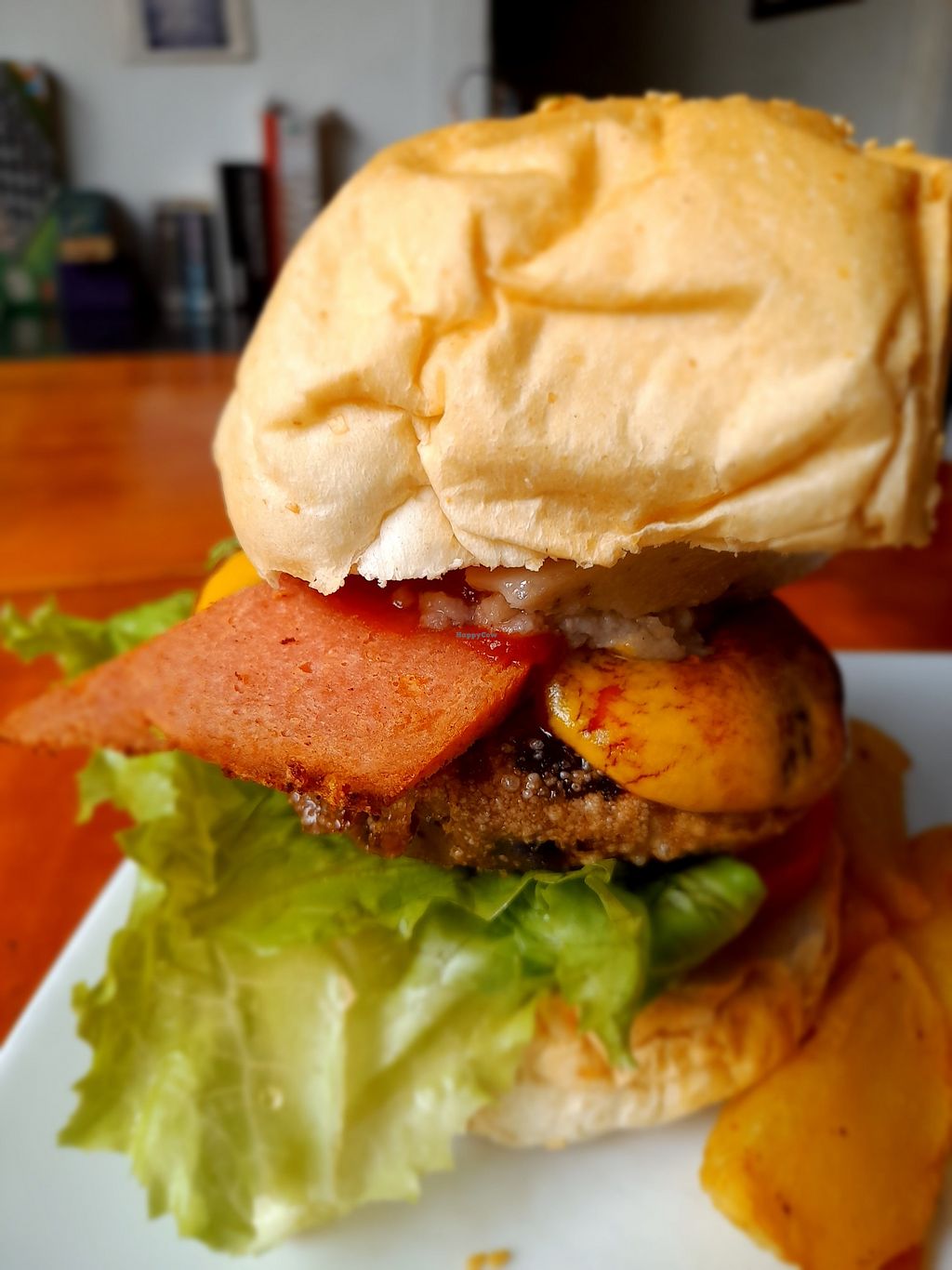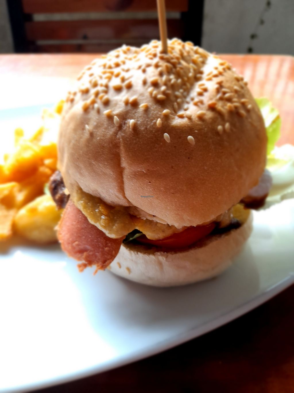 Spicy bean & cashew cheese burger with facon Bacon and homemade chips