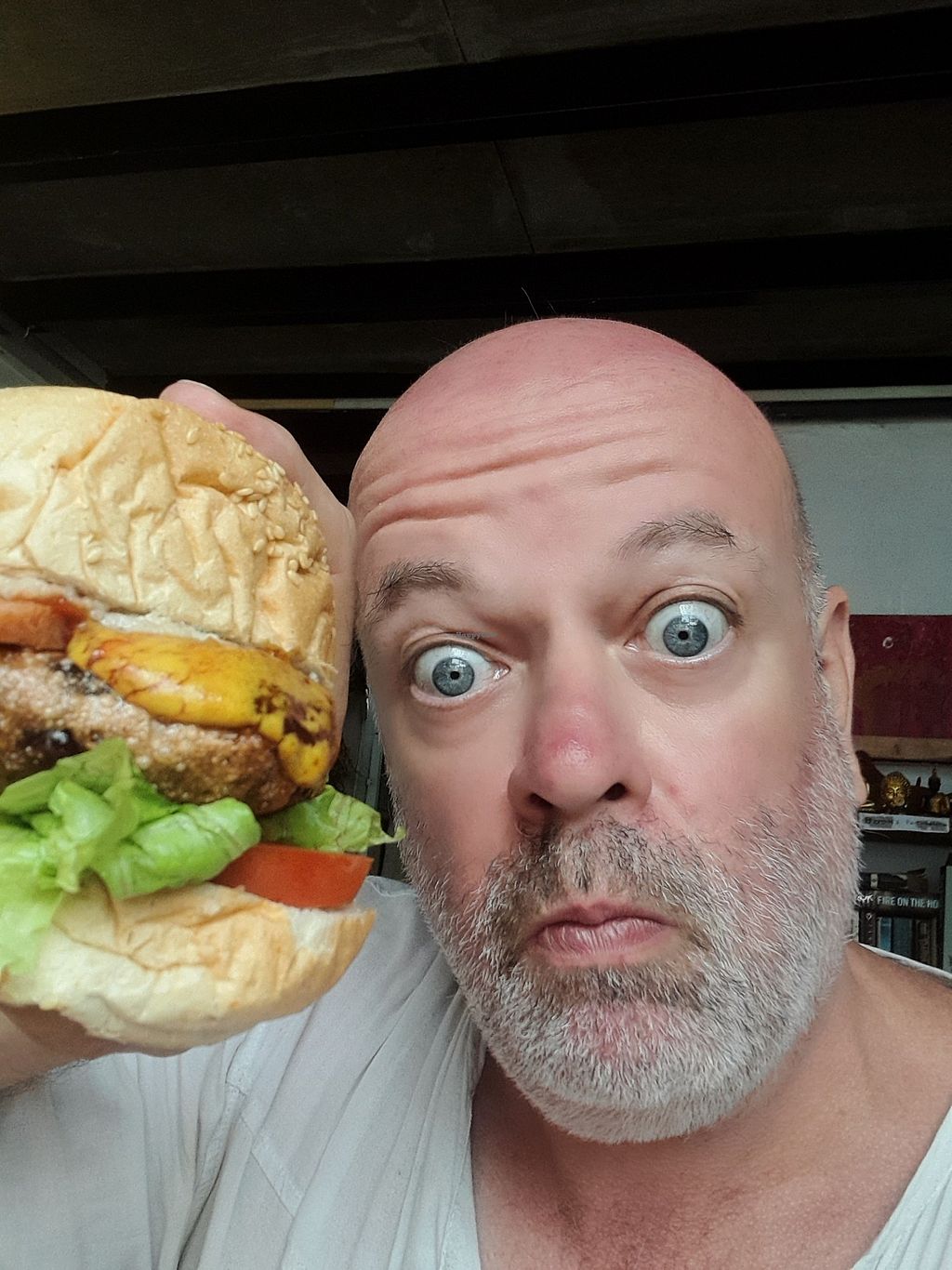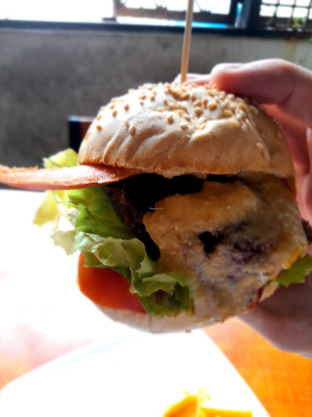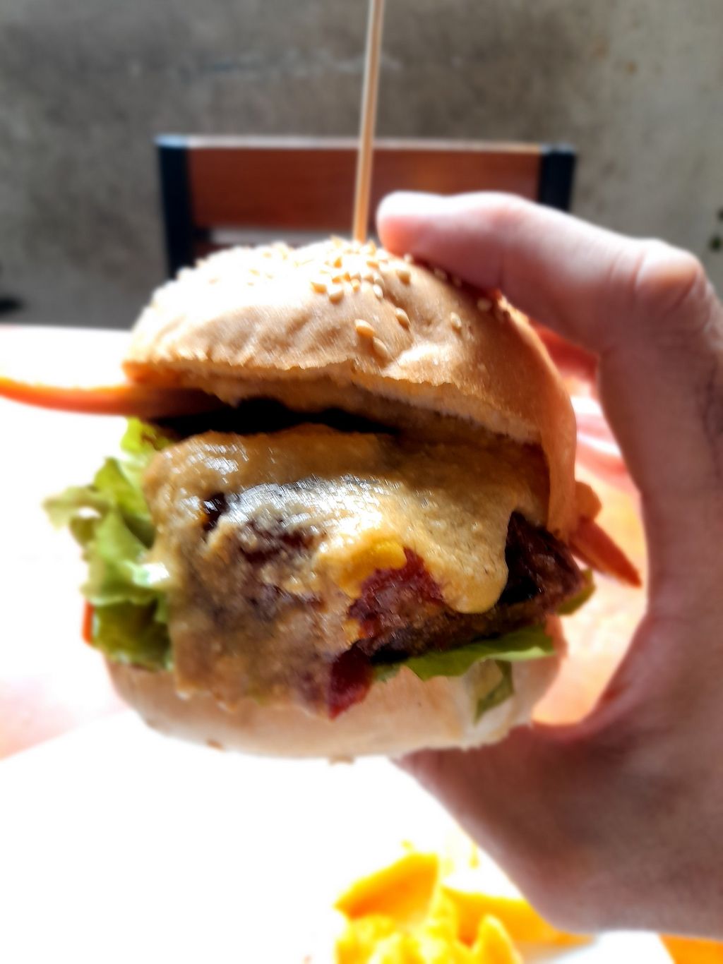 Spicy bean & cashew cheese burger with facon Bacon and homemade chips