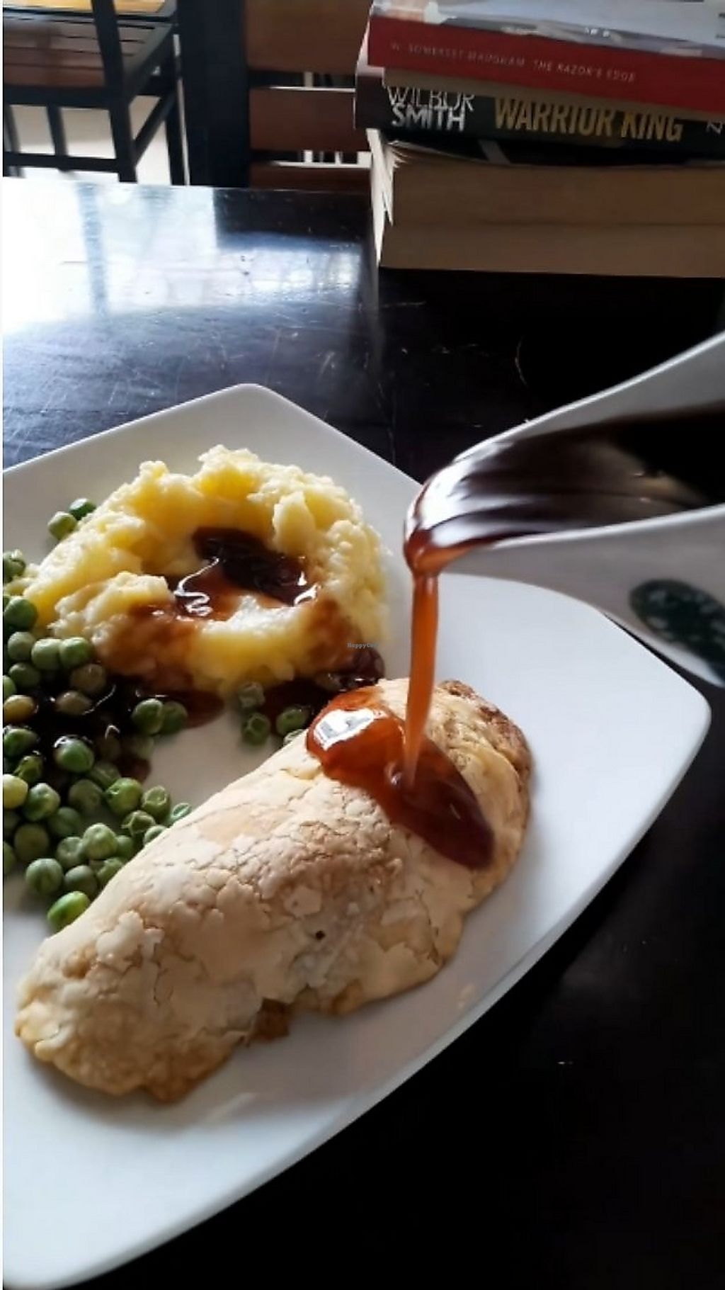 Homemade cashew cheese and onion pasty with creamy vegan mash potato, …