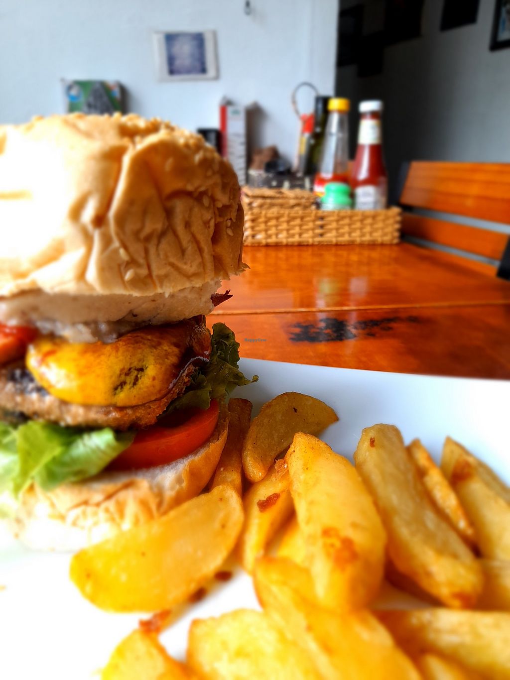Cashew cheese facon bacon spicy bean burger with fries