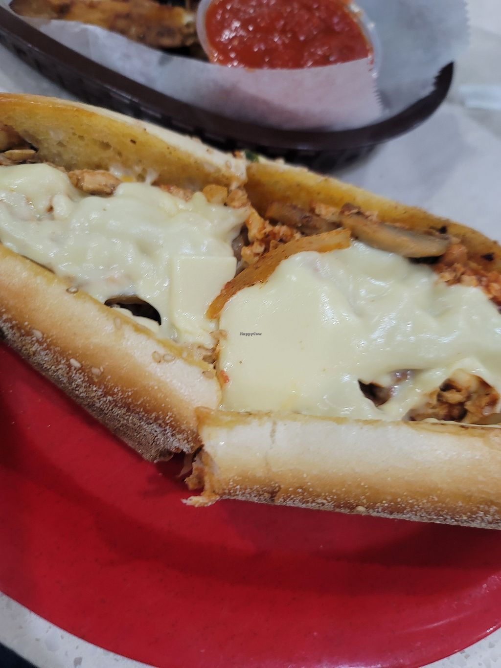 Veg "chicken" cheeze steak with provolone, marinara, onions, and mushr…