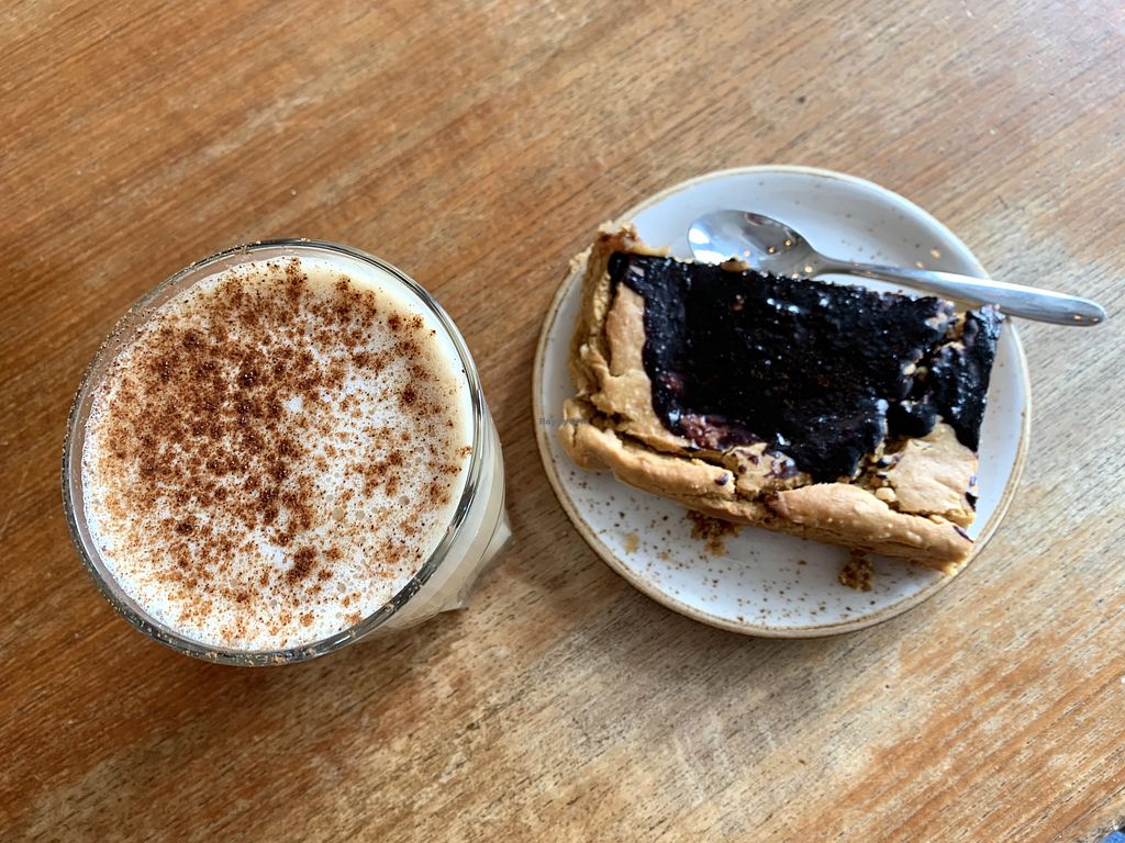 Vegan blondie with peanut butter and chocolate chunks, cappuccino with…