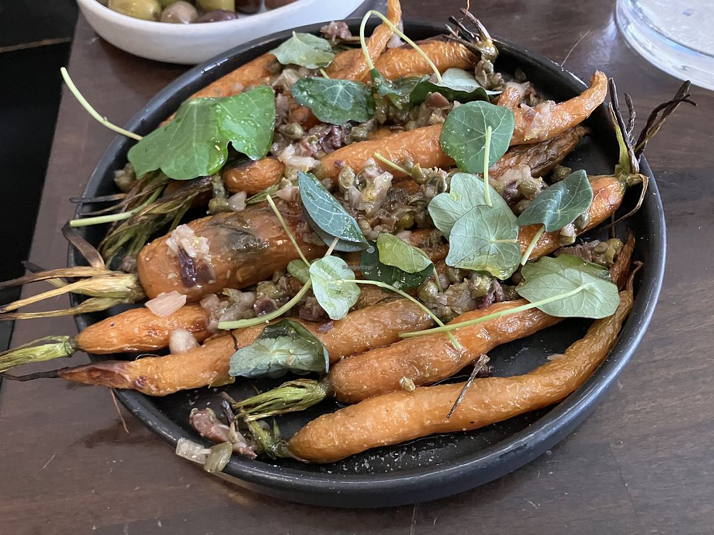 Wood-roasted carrots served with capers, chopped olives, and nasturtiu…
