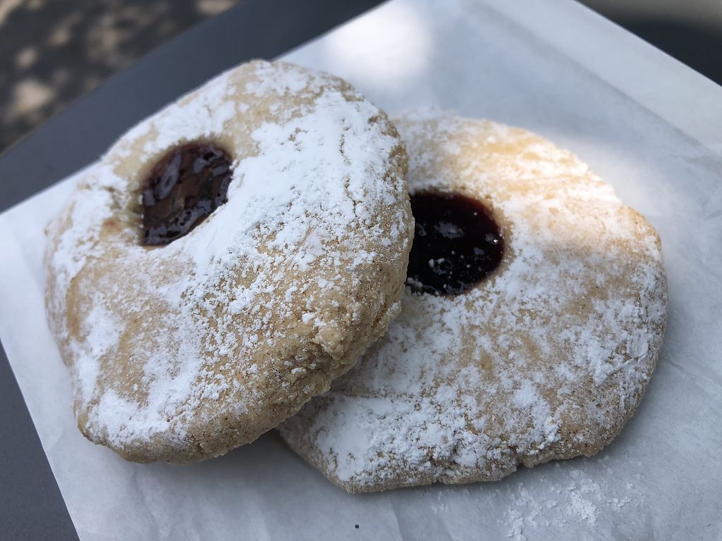 The most delicious almond, tahini, strawberry jam cookie.