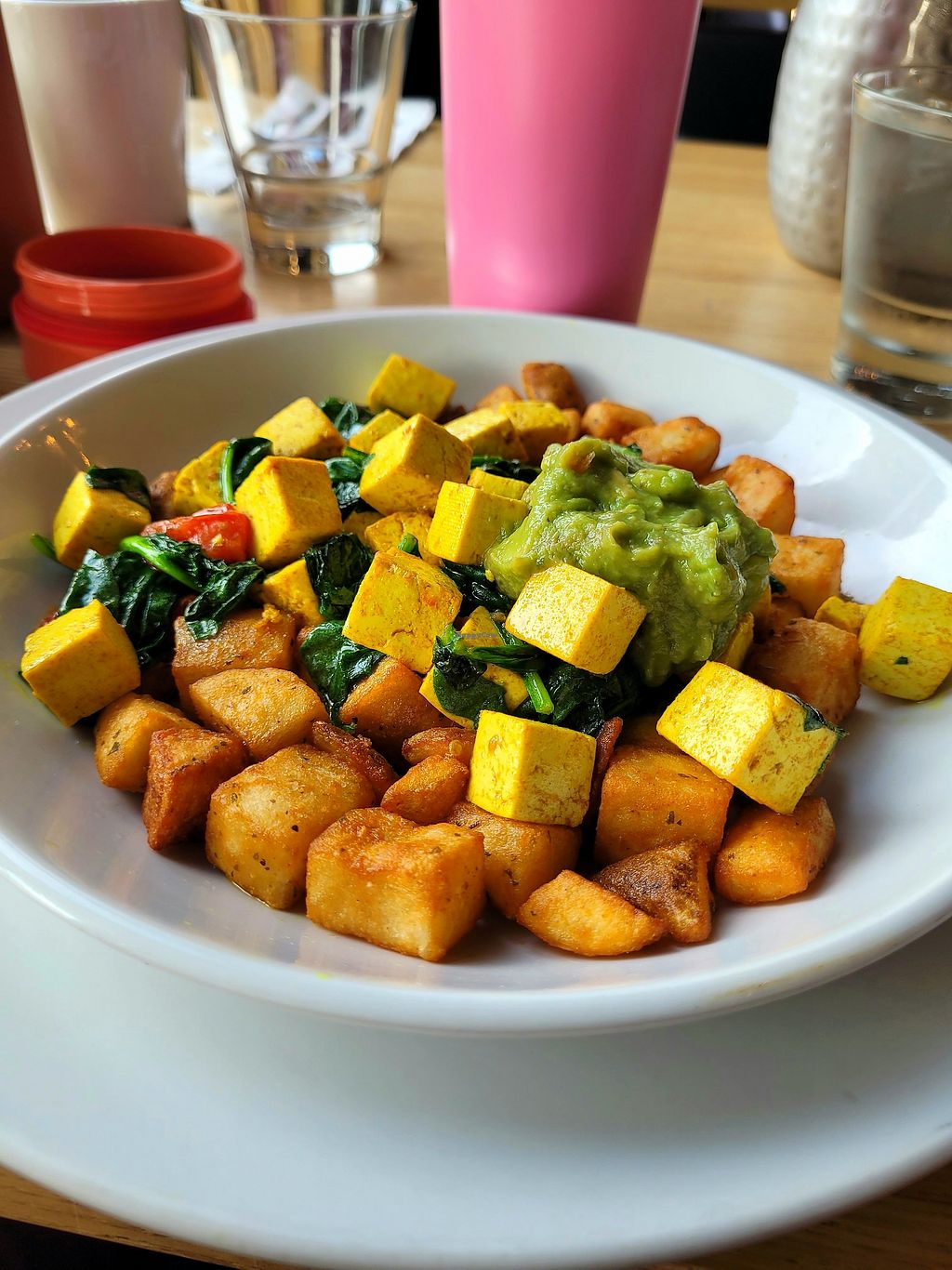 Serves meat, vegan options available. Restaurant offering a fully vegan breakfast bowl with tofu scramble, potatoes, spinach, cherry tomatoes, and avocado. Other vegan options include oatmeal, avocado toast, and a fruit cup. Some dishes can be made vegan by omitting dairy products. Open Mon-Sun 7:30am-9:00pm.