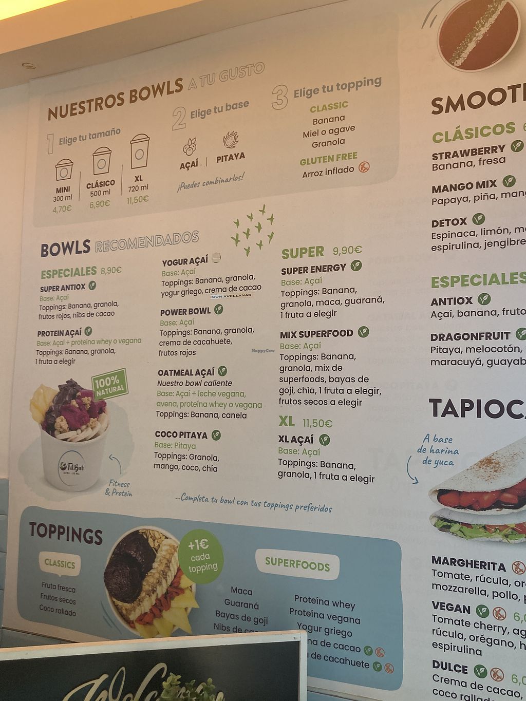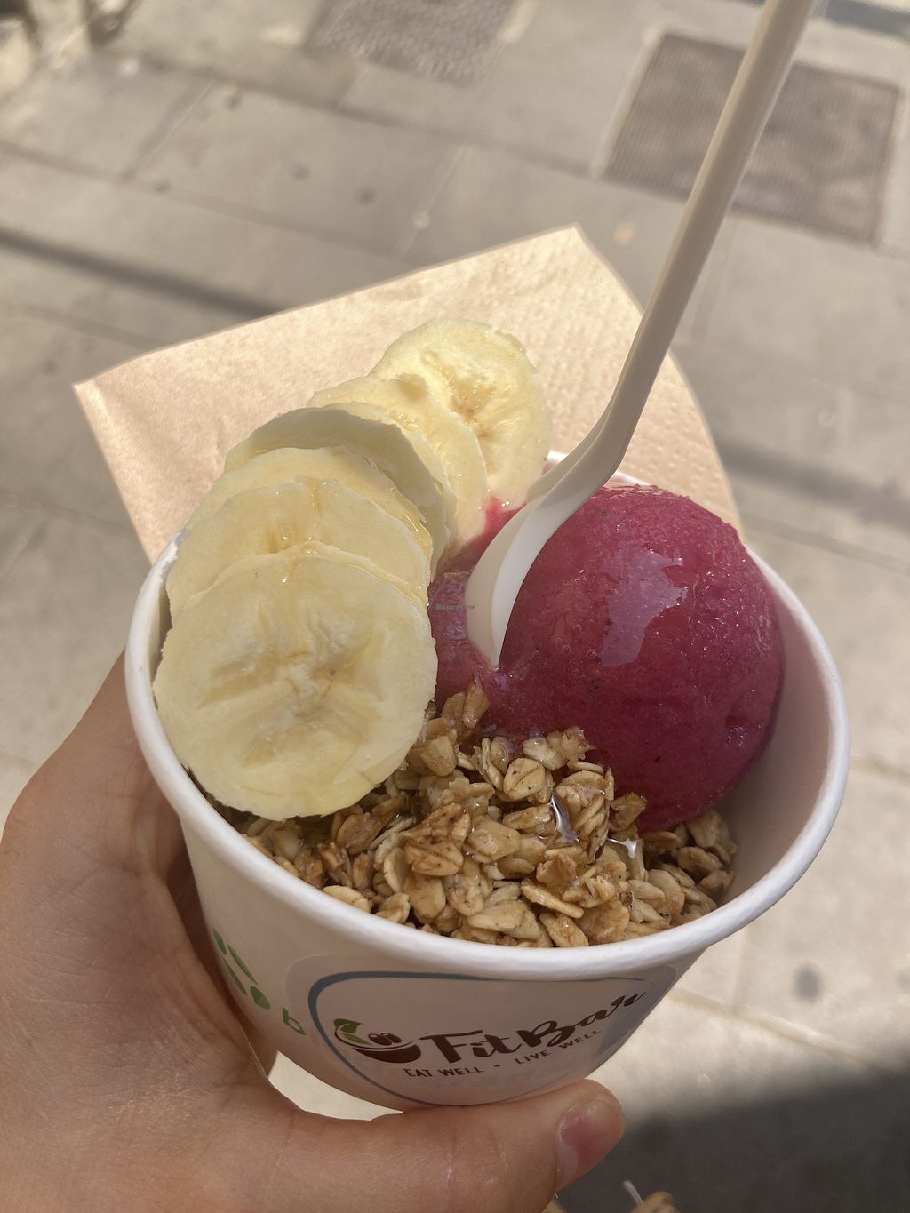 El açai bowl, lo encontré muy caro para lo que era. El açai en si estaba bueno, pero los toppings escasos. Pedí proteína vegana y la verdad que eche en falta que me la mezclarán y no solo me la espolvorearan por encima.