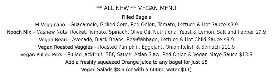 Full vegan menu with plenty of options. The bagel itself was delicious and the service great. Reasonable pricing for what you get.