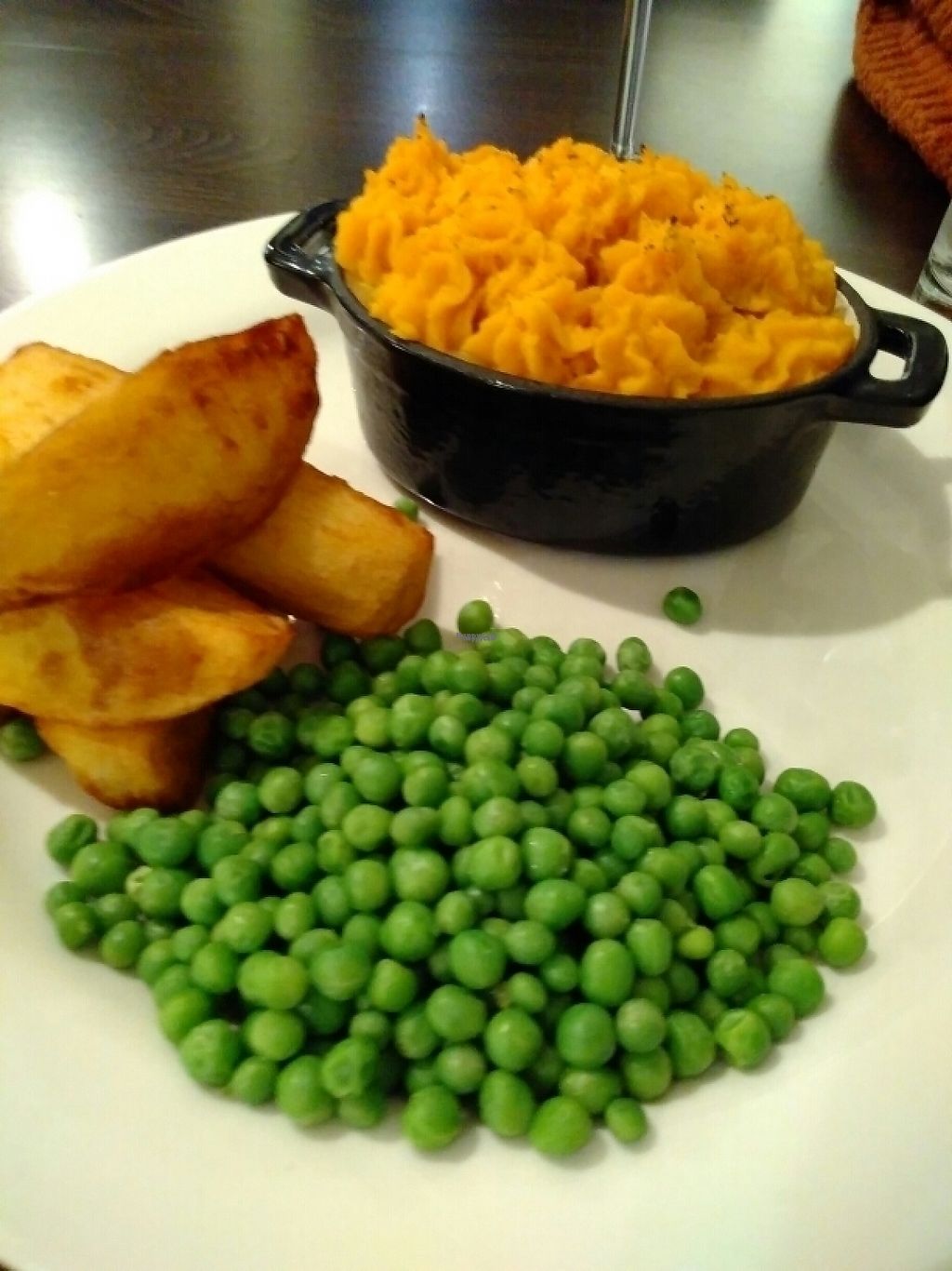 Vegan shepherd's pie with peas and chunky fries