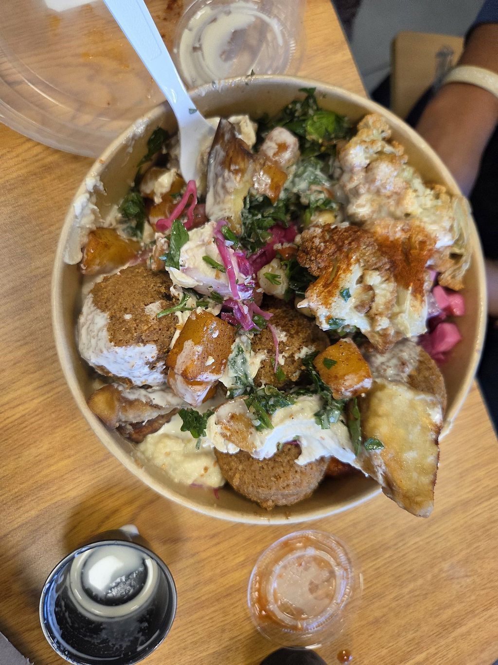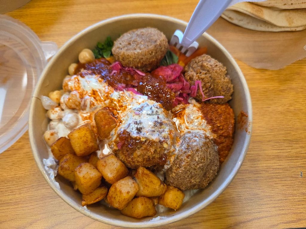 Happy Cow listing says vegetarian but the place is actually 100% vegan! The owner Fadi was very nice and explained in detail what's in everything all of their homemade recipes. And he sampled me everything too before I decided what I want. Definitely recommend the bowl, because you get a little bit of literally everything they have! And everything was truly delicious 😋 . They're Lebanese, they moved to Riverside from Lebanon in 2005 😊