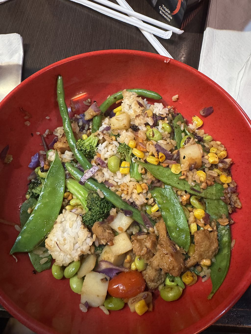 This place is definitely a fun experience. You get to create your own stir fry and it was delicious! It’s a great place to bring picky eaters since you choose exactly what you like. For vegans they have tofu, veat and seitan. Most of the sauces are also vegan. And if you put a white stick in your bowl they will cook it in a separate pan. We noticed some people putting noodles and rice in their bowls last (they said they could fit more veggies in that way). I would definitely recommend for a good fast lunch (or dinner)