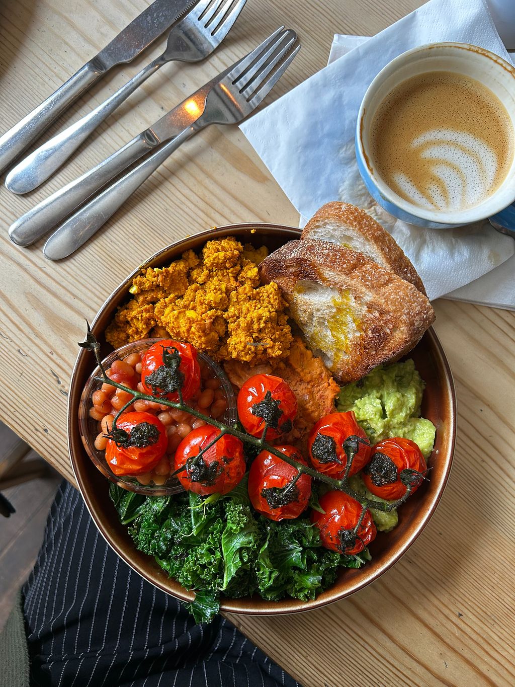 Good vegan brekfast bowl with kale, hummus, baked tomatoes, guacamole, beans and sourdough toast. They also have vegan pancakes. Nice coffee and pressed juices.
