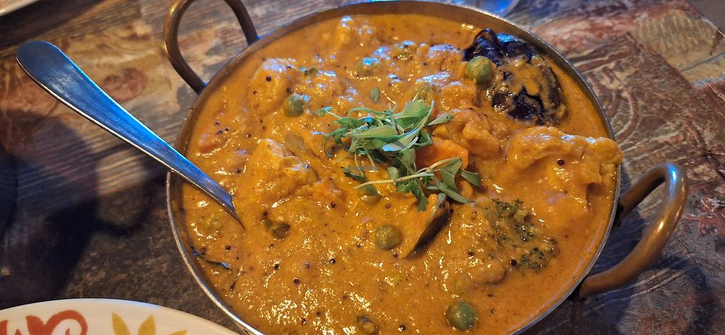 We got here just before a big crowd so we were able to get a seat right away. It got very crowded right after that. We were served an Indian cracker with two different sauces when we sat down. The darker sauce was vegan. The other was not. Ordered samosas that were delivered shortly. There’s three pieces in the appetizer. They were hot and tasty. A little bit small.