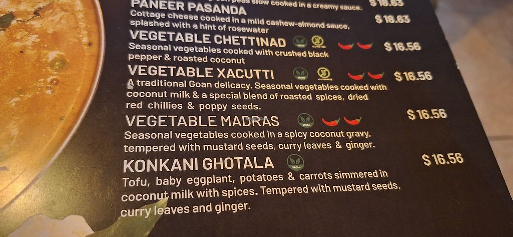 Read moreFor our meal we ordered Chana masala and aloo gobi. We enjoyed both dishes. Portions were small though tasty. Served with rice. The menu has a page of vegan entrées.