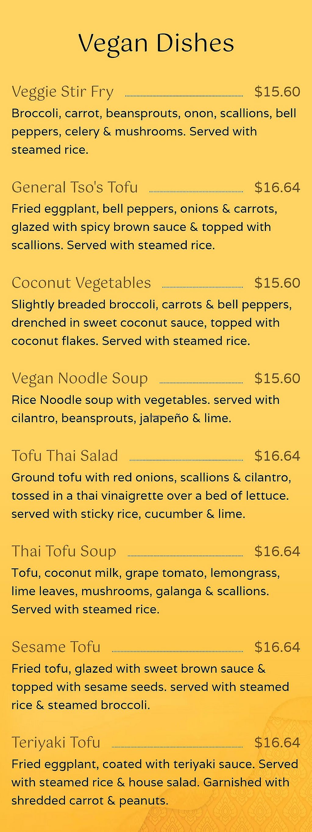 Serves meat, vegan options available. Restaurant with a dedicated vegan section on menu with dishes like “Vegan Noodle Soup” (rice noodle soup with vegetables), “Thai Tofu Soup” (tofu coconut lemongrass soup), Veggie Stir Fry (mixed vegetables stir-fried), “Coconut Vegetables” (vegetables in coconut curry), and more. Open Mon-Thu 11:00am-8:00pm, Fri-Sat 11:00am-9:00pm, Sun 11:00am-7:00pm.