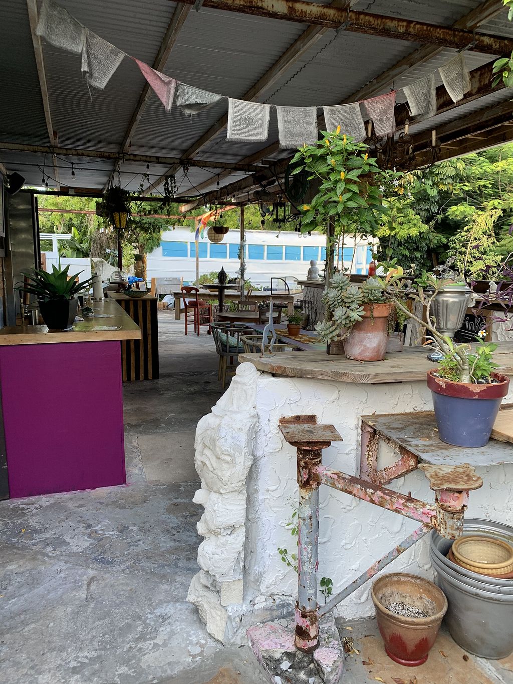 After dropping off some things at Goodwill I checked the Happy Cow app to see what I could find that was vegan in the area. Unbeknownst to me I was just down the street from the yoga studio/café. Eclectic, artsy cafe outside on a covered patio in the back with beautiful greenery and a fountain, etc. Had a very delicious sweet potato soup that was blended well and spiced just right. Added a side of crunchy sourdough toast and it hit the spot. Lovely server to boot. I think I’ll stay for one of their interesting nut-milk fruit smoothies. Yum! 5 stars! 👍🏿