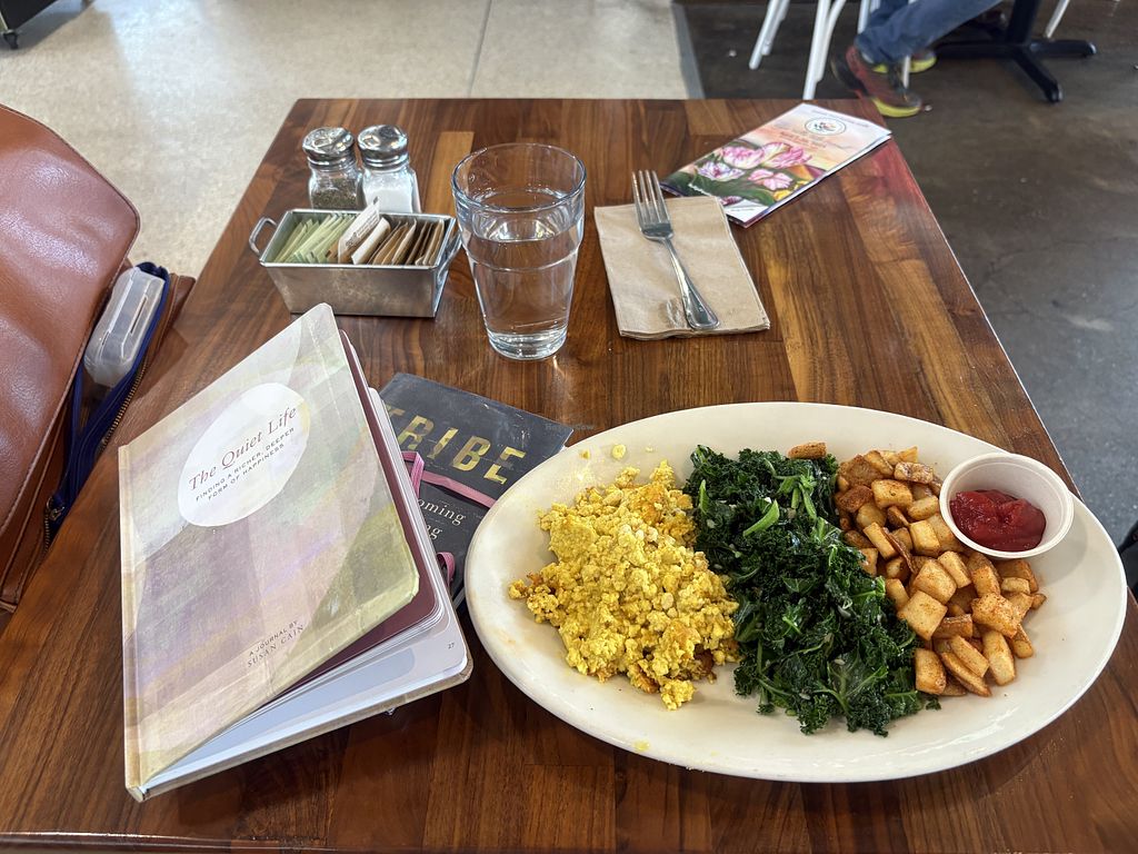 Breakfast platter with garlicky greens, crispy potatoes, and tofu scra…