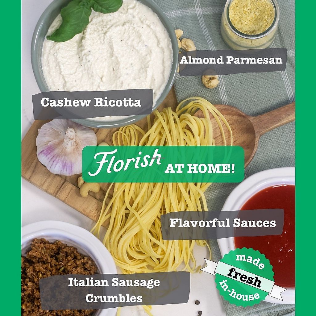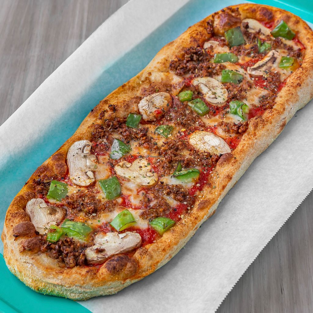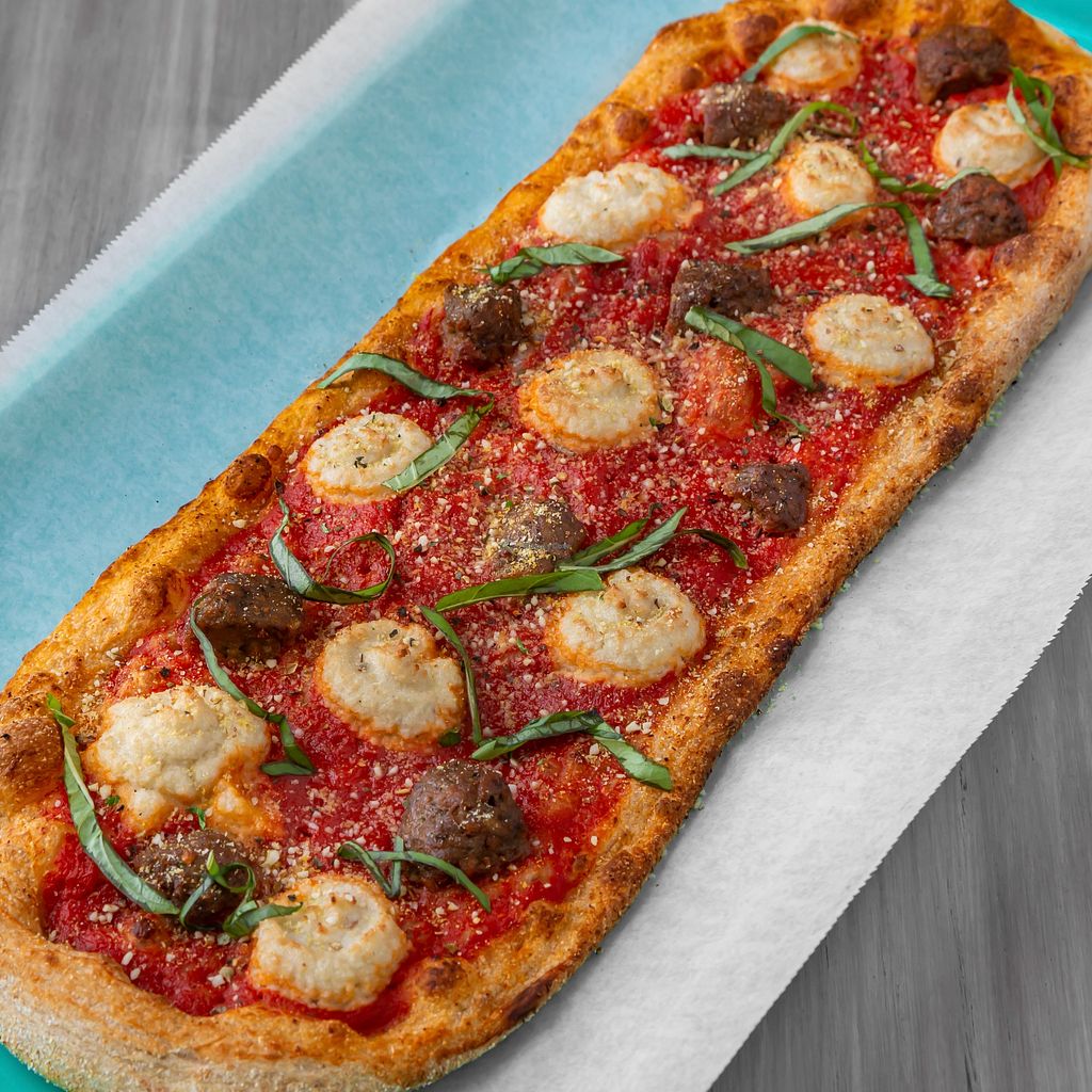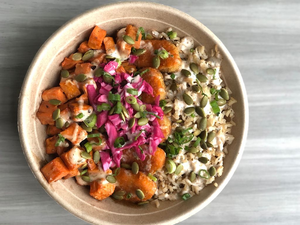 Sun Goddess bowl with custom sausage cashew cream pizza