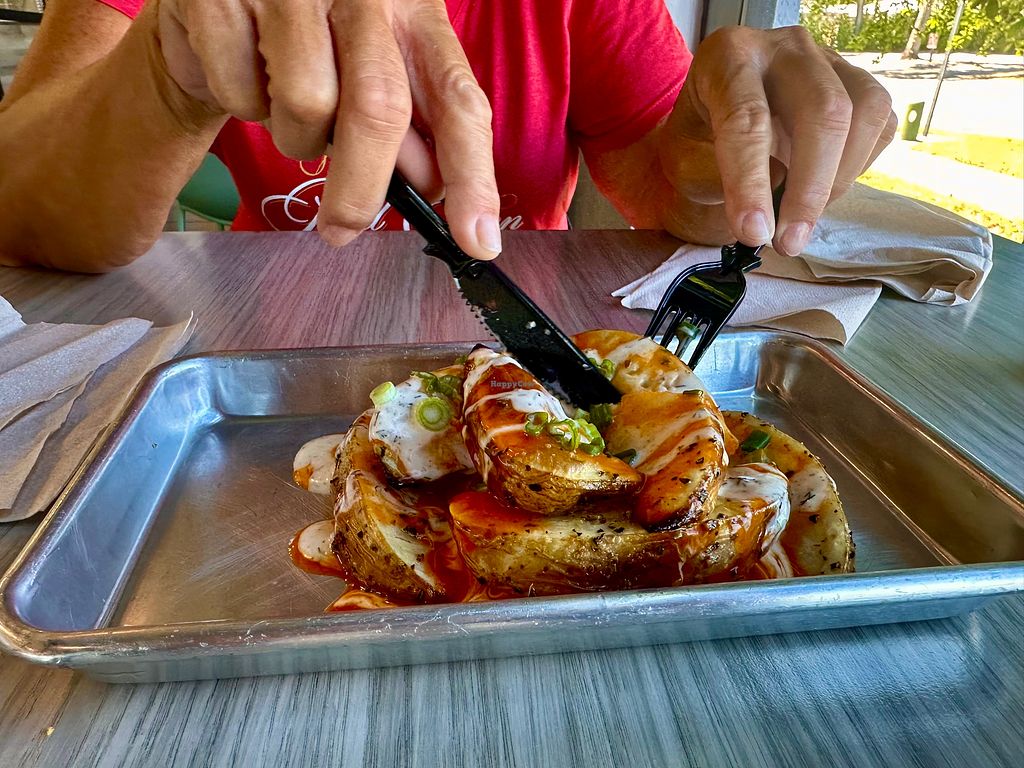 Potato slices with chicken nuggets and a side of mushrooms and kale