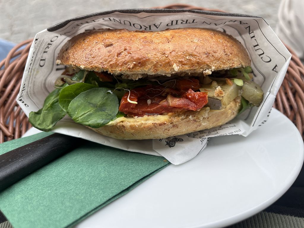 Cute cafe with a nice and fresh vegan bagel (hummus, grilled veggies and cashews). They also serve milk alternatives. The whole cafe and outside seating was full, so it took quite some time until we got everything we ordered. Other than that, everything was great.