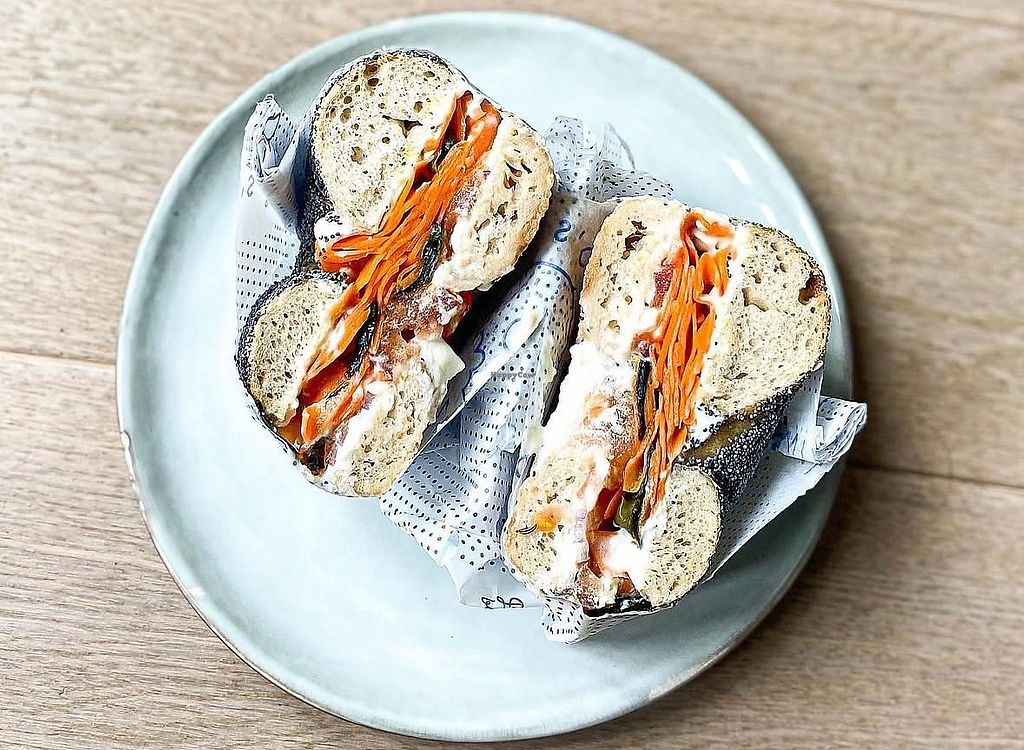 Serves meat, vegan options available. Takeaway cafe with clearly labeled menu featuring vegan-friendly hot and cold sandwiches. Also offers bagels with vegan cream cheese and carrot lox. Open Tue-Fri 09:00-15:00, Sat-Sun 09:00-16:00. Closed Mon.