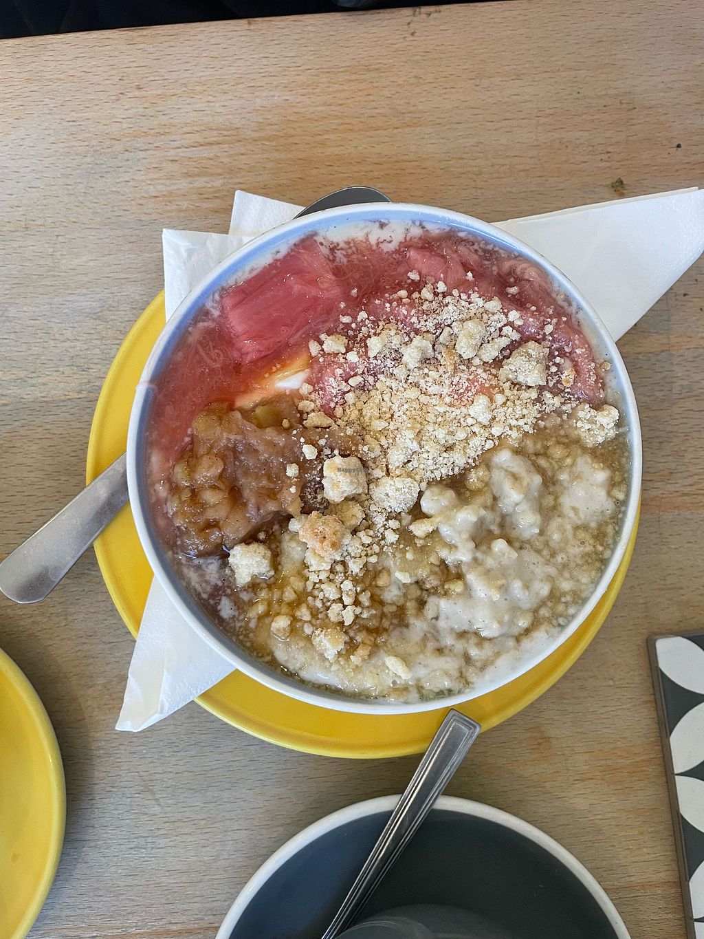 I love places that care, that put so much effort into their presentation and ingredients. And the staff there are lovely. Whether you are vegan or not, you will love the food here. I had the porridge with rhubarb, ginger, coconut yogurt and crumble. Delicious and large portions. Friends had exceptional egg sandwiches. Highly recommend but be warned, they are small and very popular.