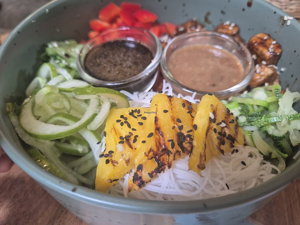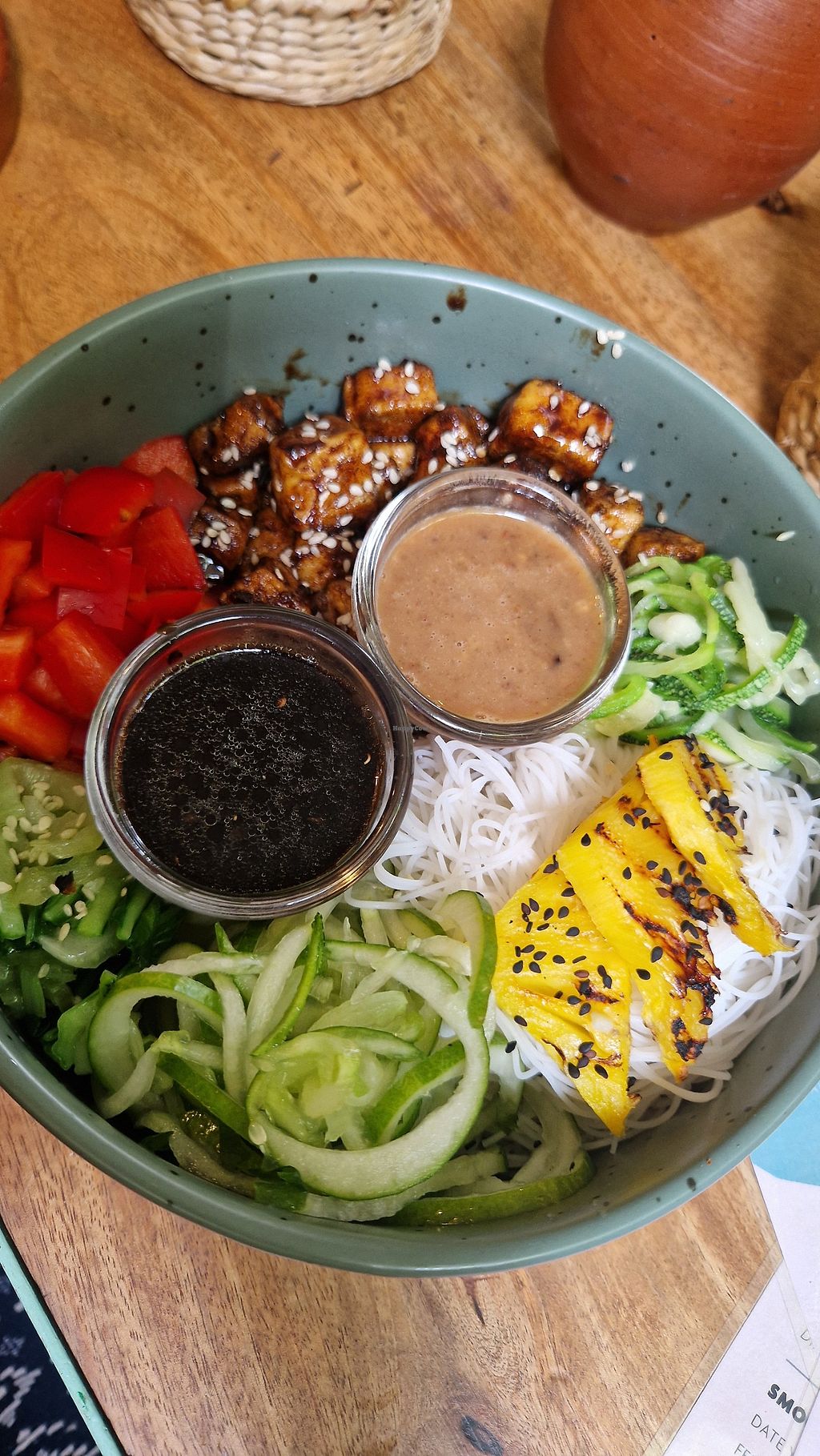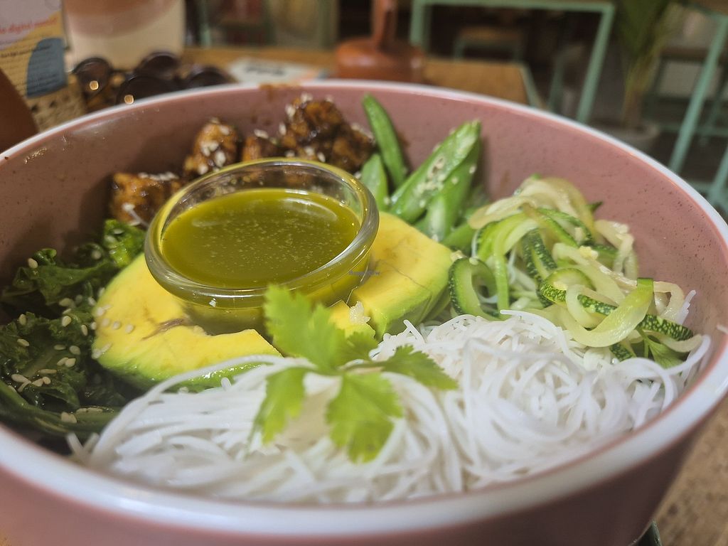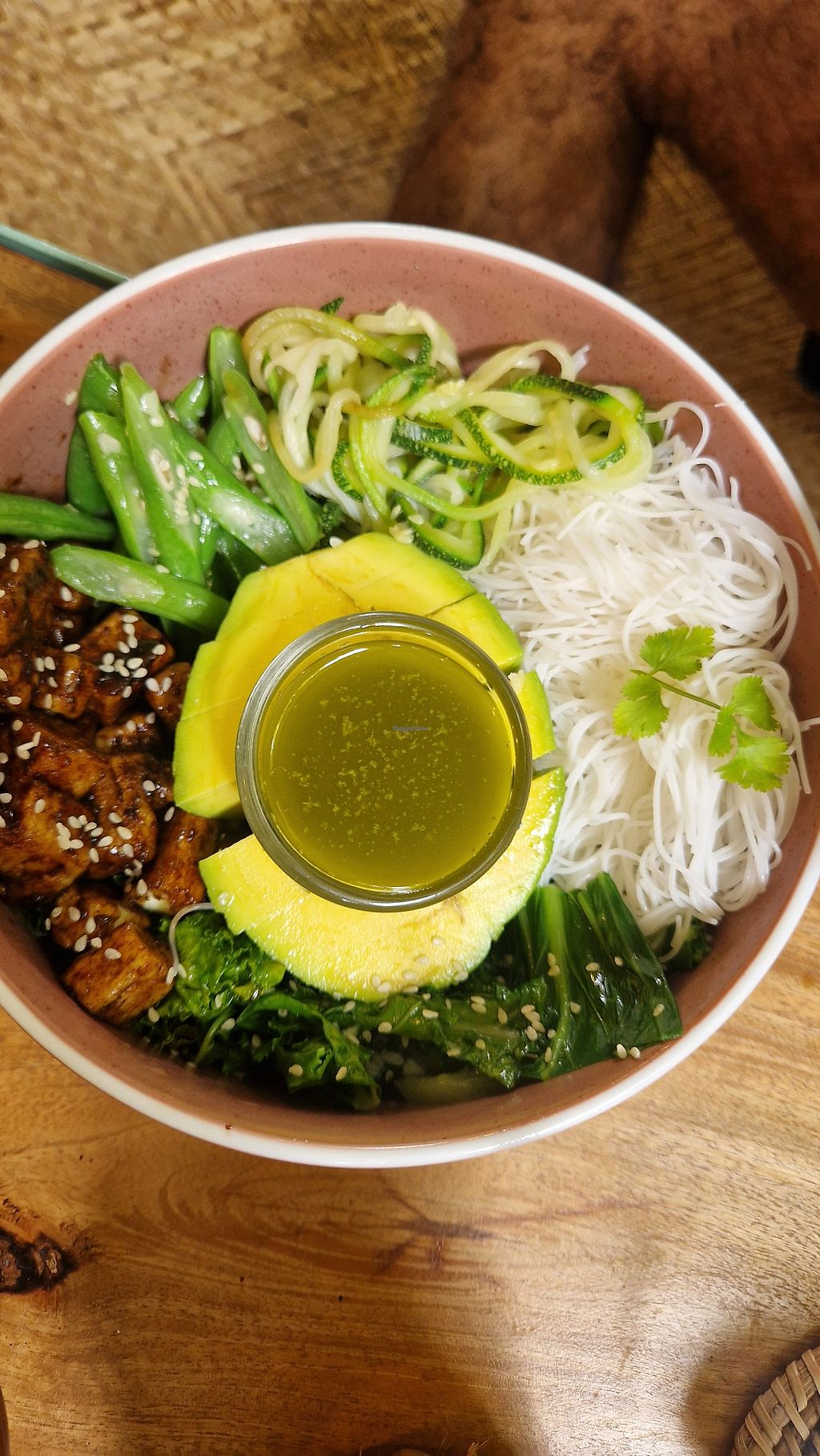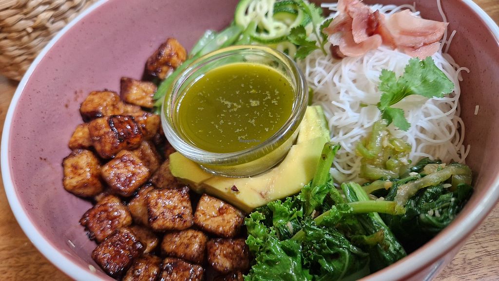 Tried two of their noodle bowls! Both are really good and the sticky tofu is perfect! Iced coffe also good and the bliss ball is tasty