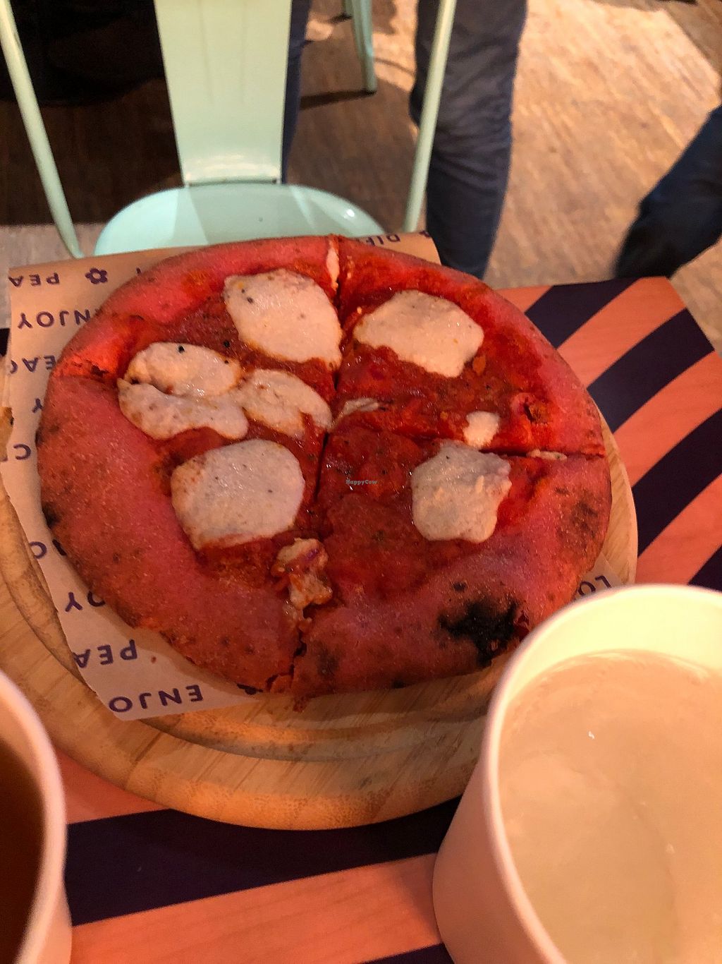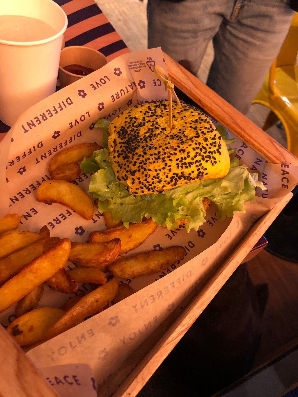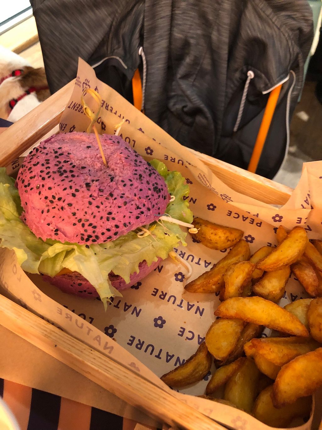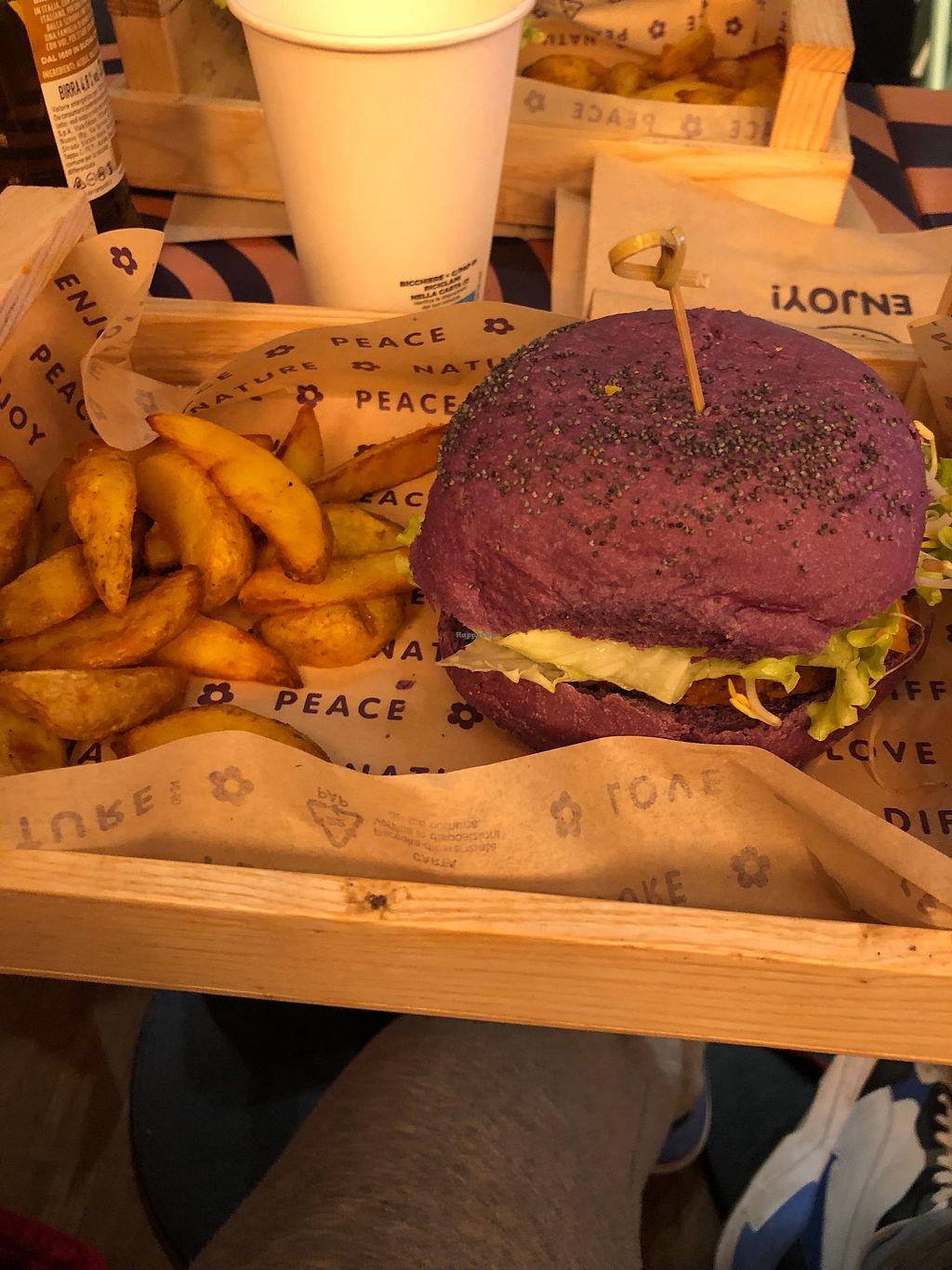 Spicy burger (yellow bun) and cheesy burger (purple bun)