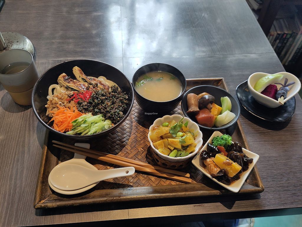 Fresh cedar sauce & vegetables w/ noodle. Fruit bowl. Vegan!