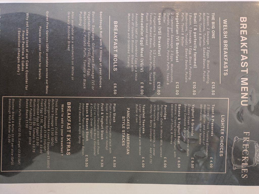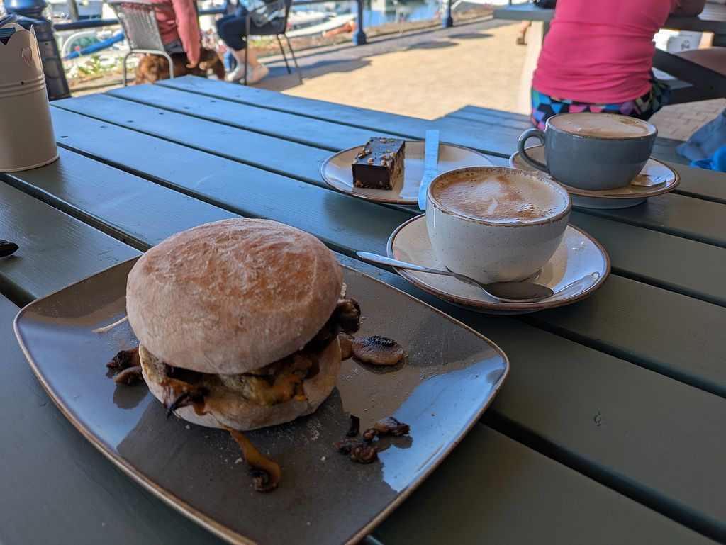 Vegan breakfast bap, chocolate pretzel slice and oat flat whites