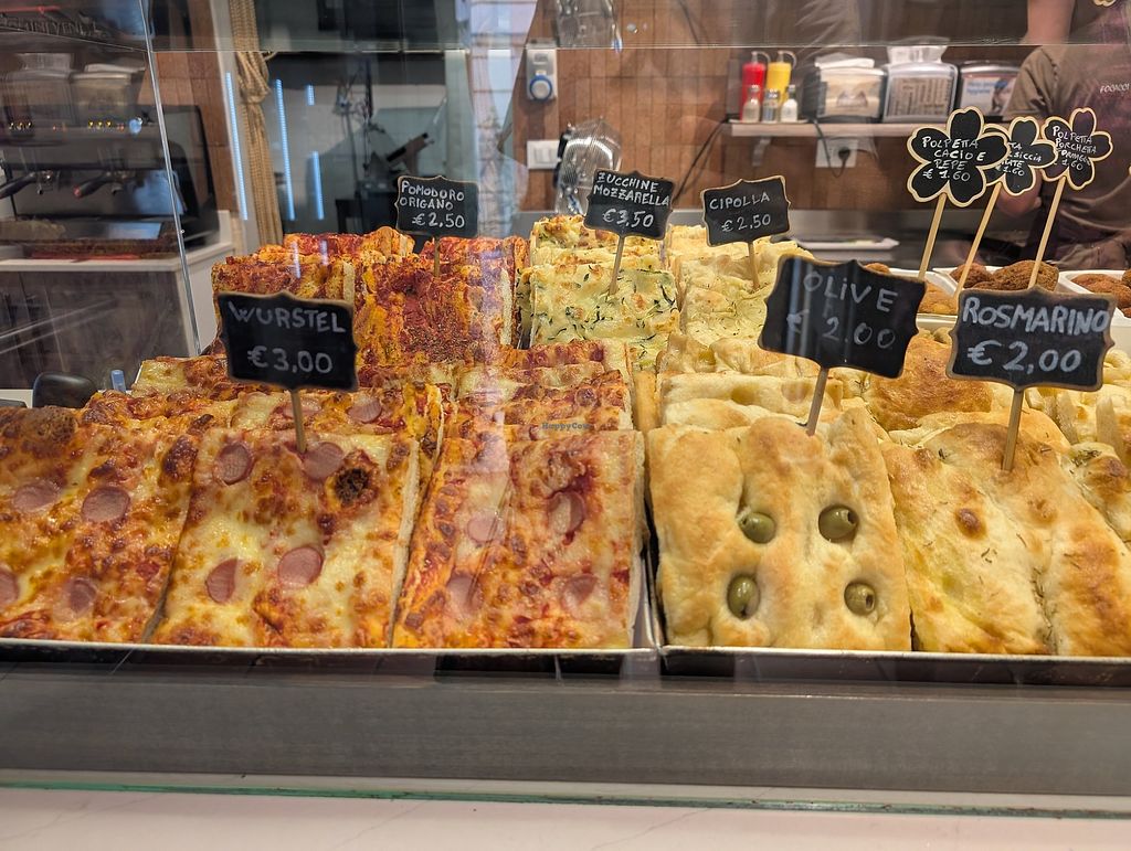Viele vegane Sorten, schmeckt super, schont die Reisekasse. Die Verkäuferin hat extra gefragt, ob ohne Käse und mit Käse auf das gleiche Blech darf - "I don't want anybody of you to die" ❤️