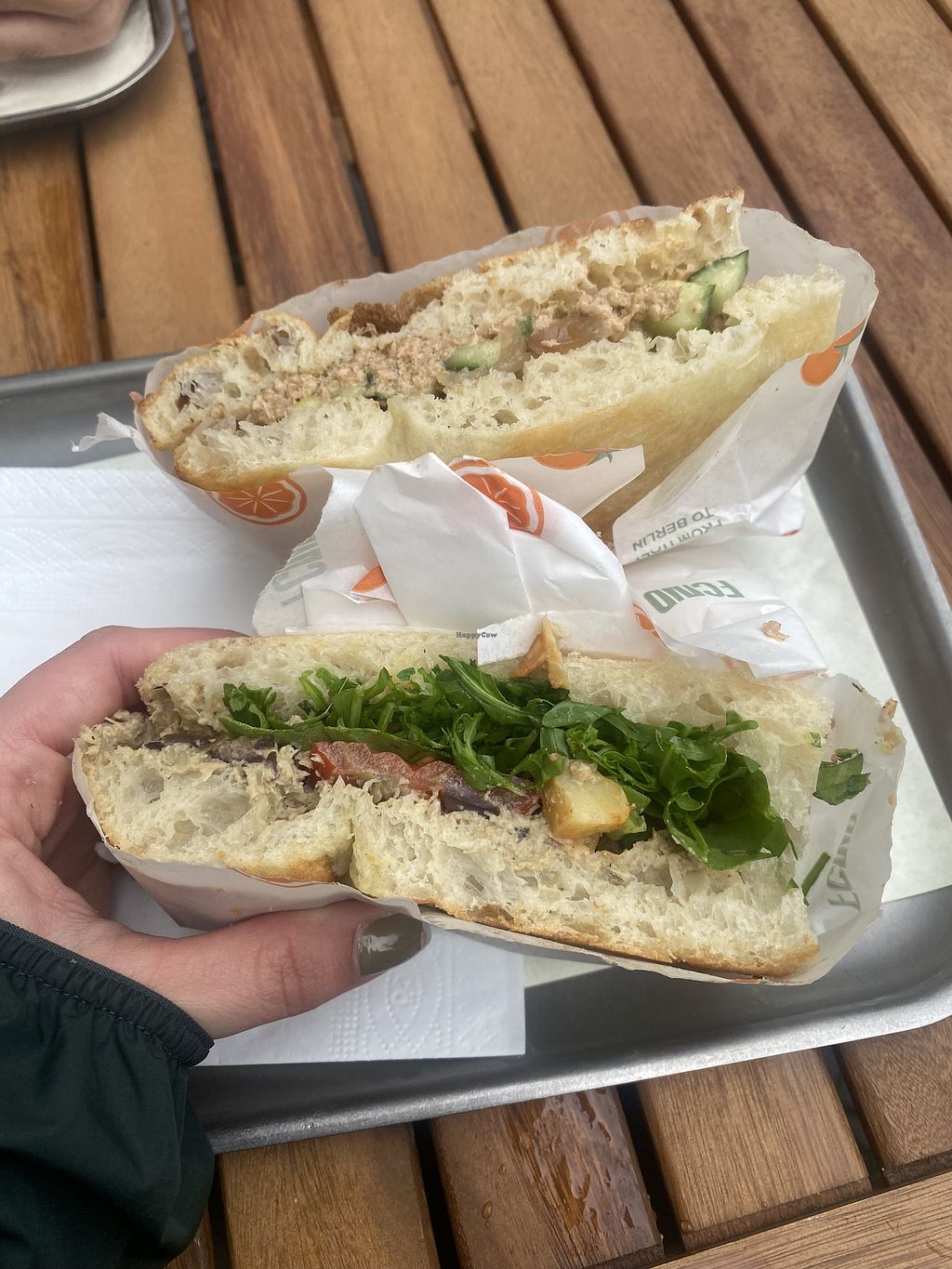 Italian sandwich restaurant selling focaccia bread. Two different vegan breads. One with vegetables and one with vegan tuna. We tried both of them and they were absolutely delicious. Also has oat milk for coffee. Latte with oat milk was really tasty. Service was friendly.