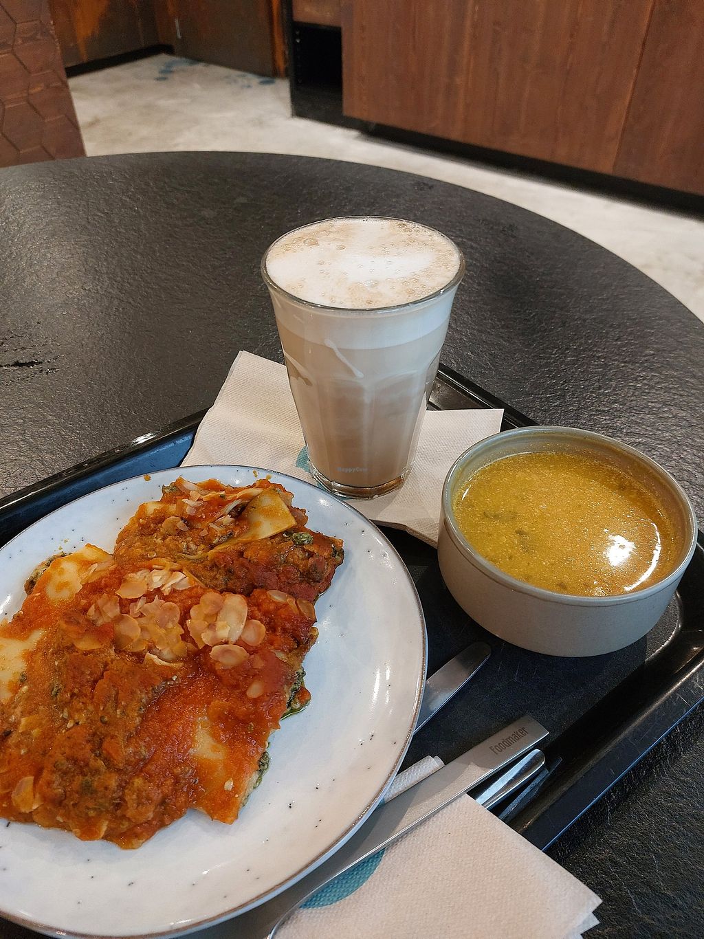 Vegan lasagne, pompoen tandoori soep en chai latte met havermelk