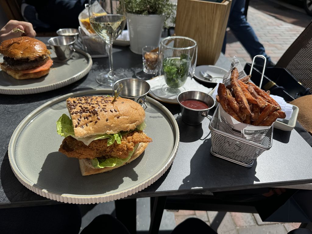 Delicious Burger for lunch with sweet potato fries. Also offer vegan milk.