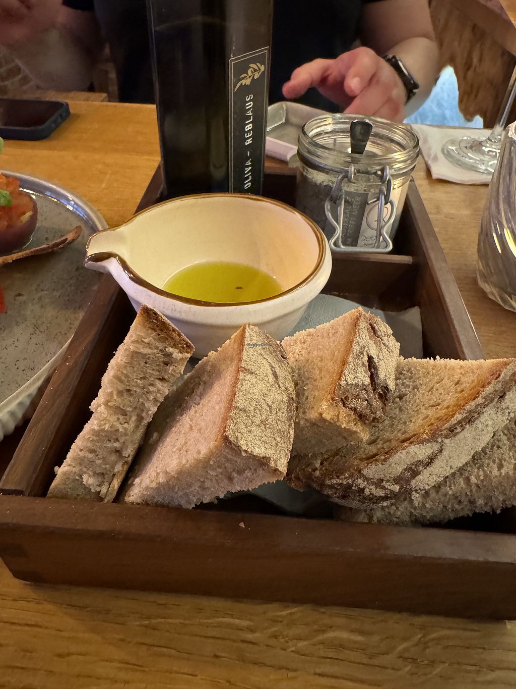 Wir haben uns hier einmal durchprobiert. Als kleiner Gruß aus der Küche haben wir zunächst mit einem Brotkorb mit Olivenöl und einem Sylter Kräutersalz gestartet. Das Olivenöl war von hoher Qualität, genauso wie das regionale Brot und Salz.