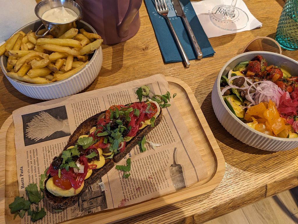 Ich habe alles was vegan war auf der Karte bestellt. Das heißt ich hatte Oliven als Vorspeise, dann als Hauptgericht einen hummus Sauerteigtoast, Pommes und einen Beilagensalat. War schon lecker, aber hätte mir zu den Oliven ne Scheibe Brot gewünscht, Pommes schmeckten Standard und ich fand die vegane Mayo irgendwie nicht so gut. Der Toast war ganz lecker aber ich hätte gern ein substantielleres essen als einen Toast gehabt. Außerdem habe ich glaube ich genug Avocado Toasts et al. In meinem Leben gegessen, hätte auch gern mal was anderes gehabt. Am besten war noch der Salat, leckeres Dressing, und gute Konstellation von gepickeltem und Standard Salat.