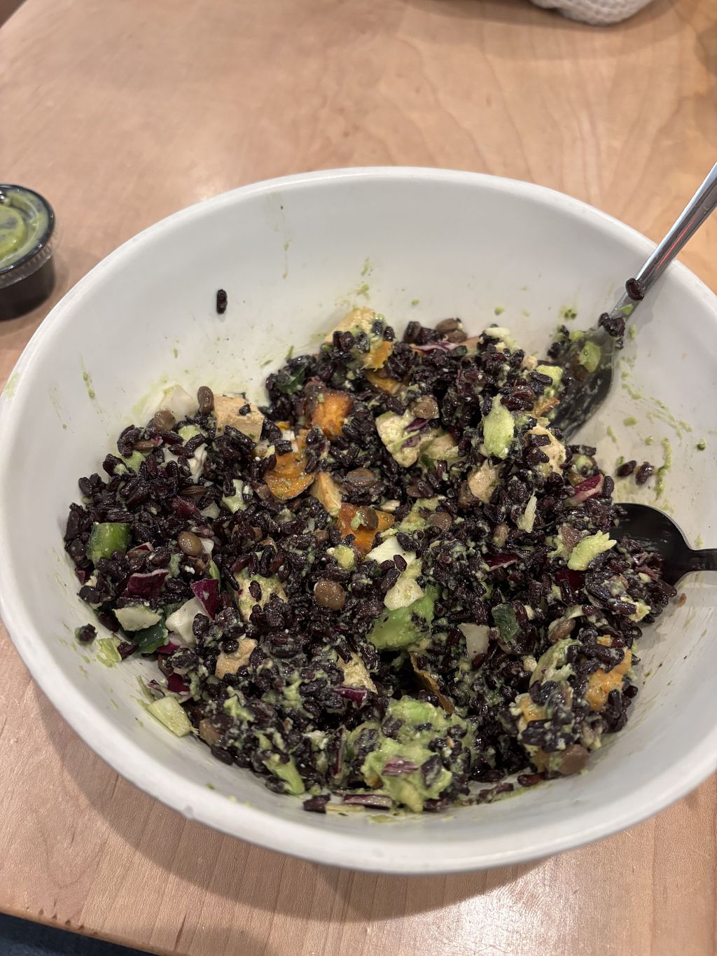 The build your own bowl is so good. I always get the citrus fennel in mine and the lentil meatballs are SO GOOD. And the pesto sauce is vegan too!